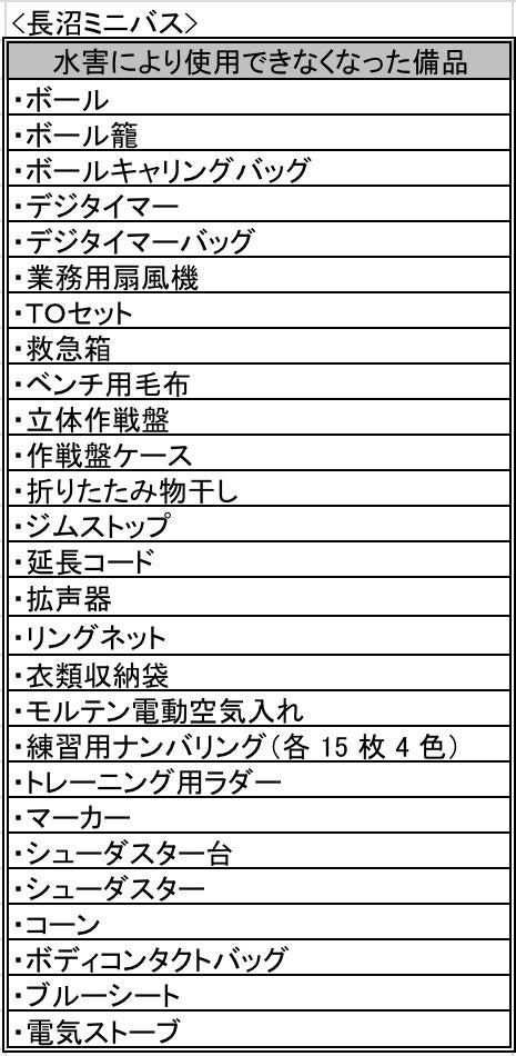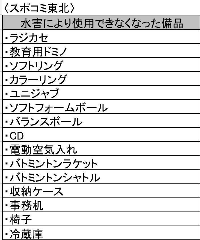 スポコミ東北は事務所が被災し、事務所としての機能が困難な状況となっています。長沼ミニバスでは週4回長沼小学校と長沼体育館で練習をしていました。災害後は近隣の体育館に空きがないため、遠方の体育館まで練習に行っています。しかし、体育館使用料が必要であったり暖房費等の捻出も必要になっています。また、泥に浸かってしまって使えなくなってしまった練習道具や備品が沢山あります。長沼小学校の体育館が使えるようになるのは半年以上先となり、長沼体育館においては再建設の目処は立っていません。このプロジェクトでは長沼ミニバスの今後1年間の体育館料と練習道具・備品の購入、また被災者の遠征費、スポコミ東北の事務所備品の購入に充てたいと思ってます。