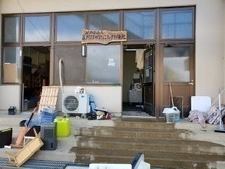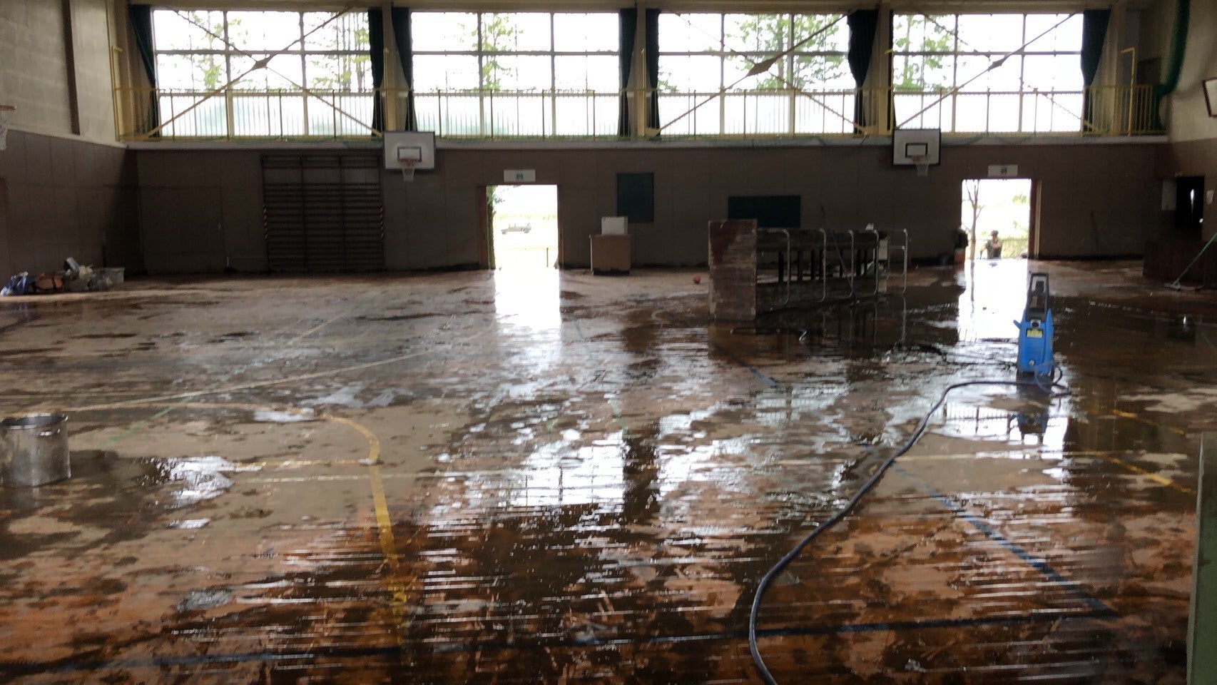 ▲保護者やボランティアの方々にお手伝いいただき、泥を掃き出し床を水洗いしました。