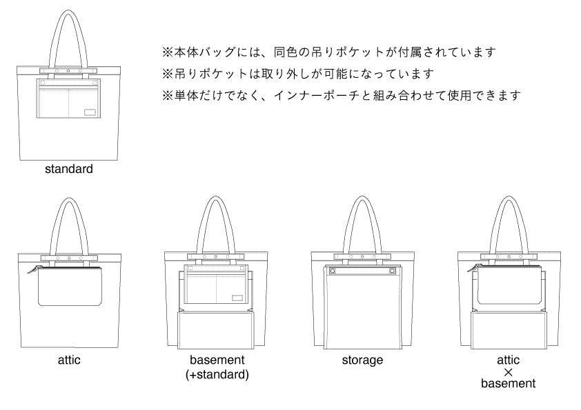 本体となるトートバッグと、インナーとして活用できるポーチを装着、取り外しができる仕様になっています。