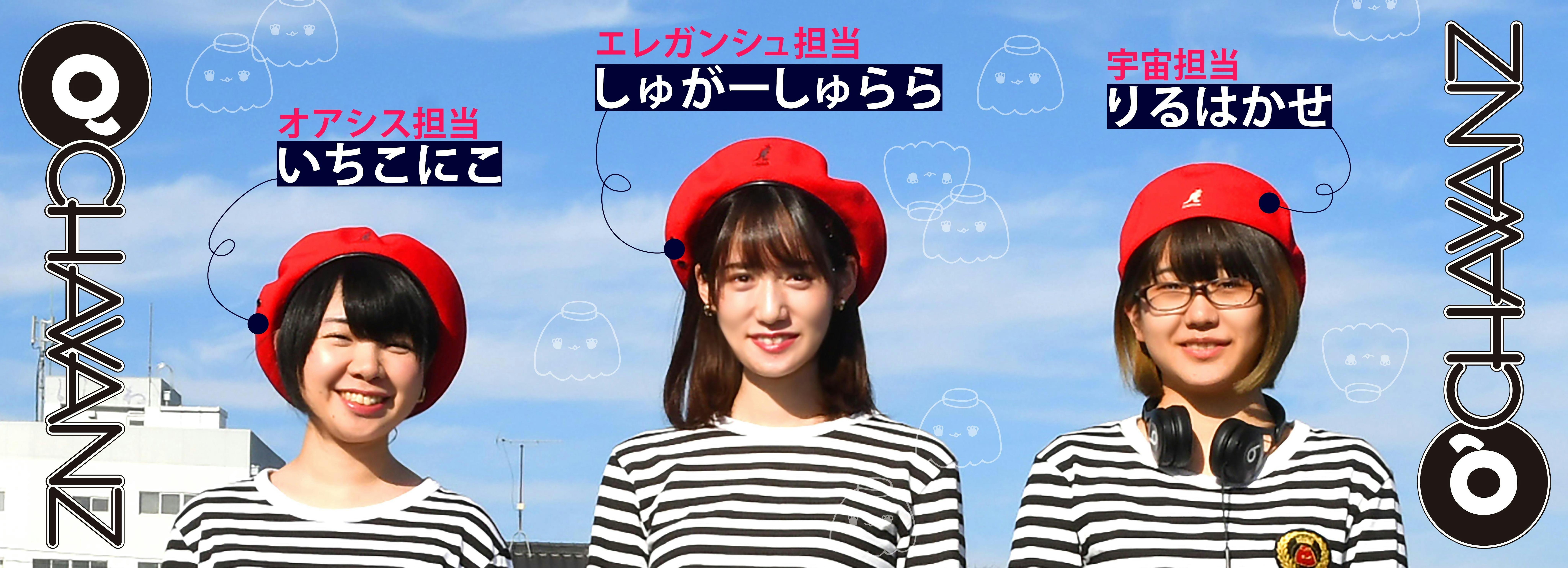 文化系アイドルヒップホップユニットO'CHAWANZ (オチャワンズ)。エレガンシュ担当しゅがーしゅらら、オアシス担当いちこにこ、宇宙担当りるはかせ。自らリリックも手がけるクレバーな3人が、変幻自在・摩訶不思議なスタイルのラップを披露。