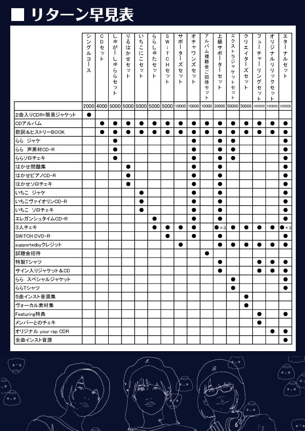 今回のプロジェクトはAll or Nothing方式とさせていただきますので、目標金額を達成できなかった場合は、アルバム及びリターンの制作は見送りとなります。