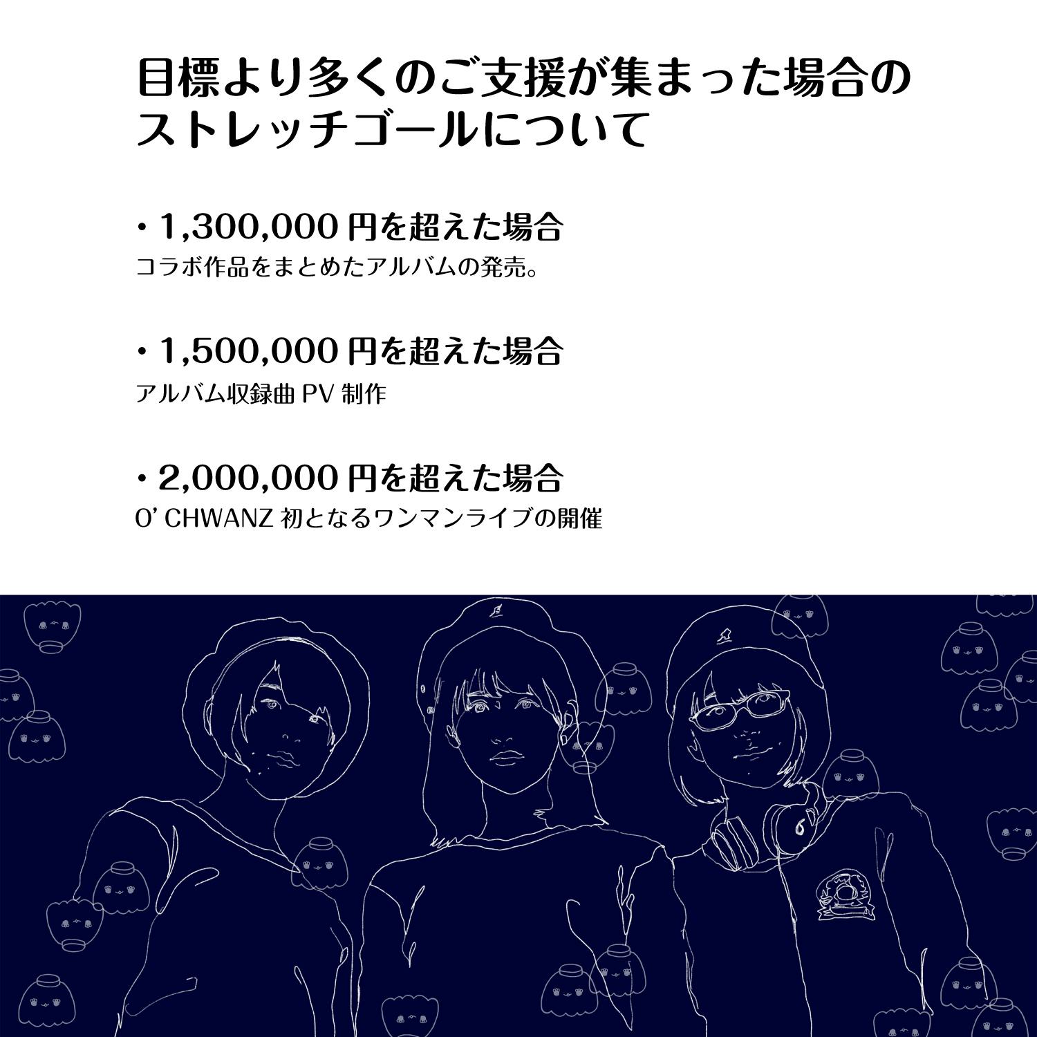 今この3人と作る O'CHAWANZ の音楽 をパッケージし、より良い環境でアルバムとして形に残したい!と思います。そして、O'CHAWANZのキャラクターをたくさん詰め込んだアルバムを、支援して下さった皆さんに、リターンとしてお届けしたいと考えています。