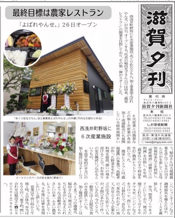 2年程前から稲田さんは塩津で『よばれやんせ。』というお洒落なレストランを開かれています。高齢となると活動範囲が制限され、ちょっと車で街まで食べに行く事も出来ません。そんな中で、若者だけでなく、齢をとっても老人車で行けるレストランを目指して店を拡張されるとの事。これまで私たち夫婦も何度か訪れましたが、ぜひ皆様も『ちょっとお洒落な温かいお袋の味』を楽しみ、幸せな気持ちになって頂くことを願います。