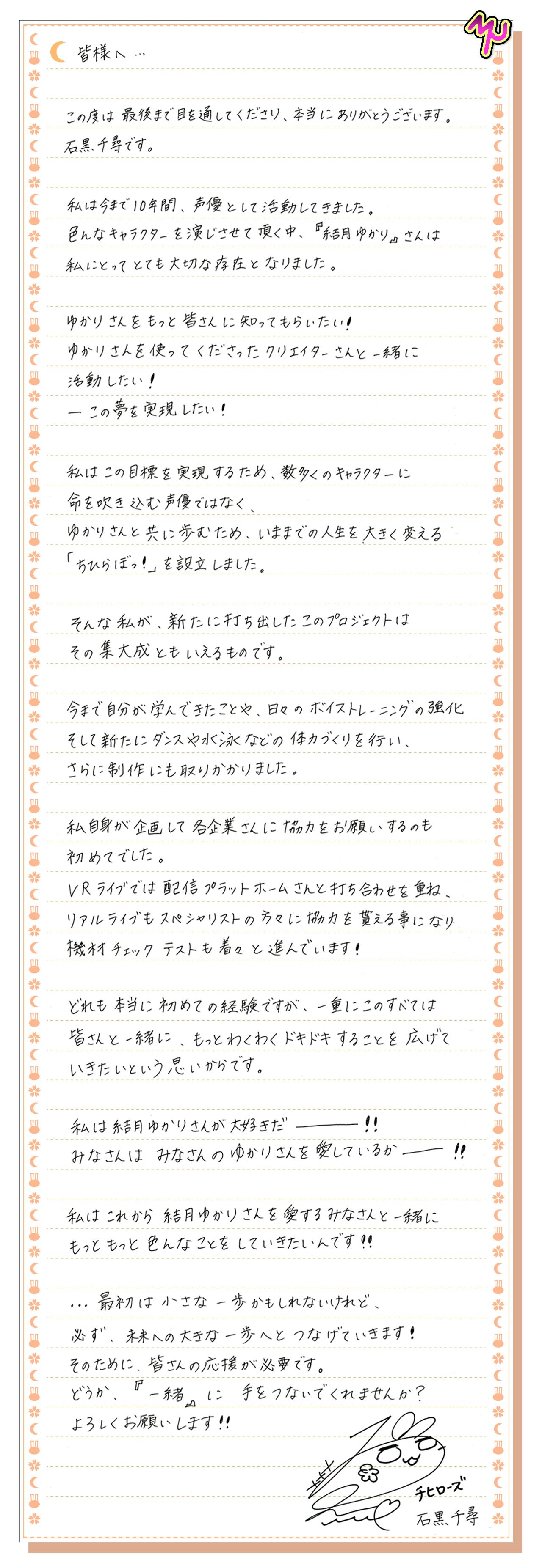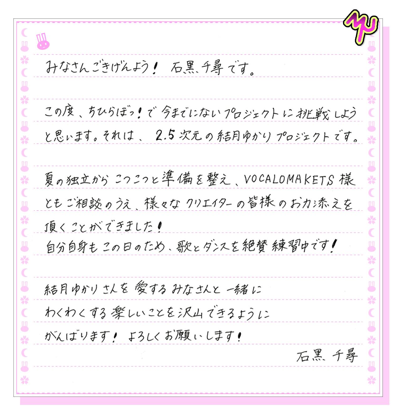 私も結月ゆかりを愛する、いちユーザーとして、ユーザーの皆さんと一緒に手を取り合いボーカロイド、ボイスロイドを愛する皆さんと一緒にさらに楽しい企画を考えていけたらと思っております。