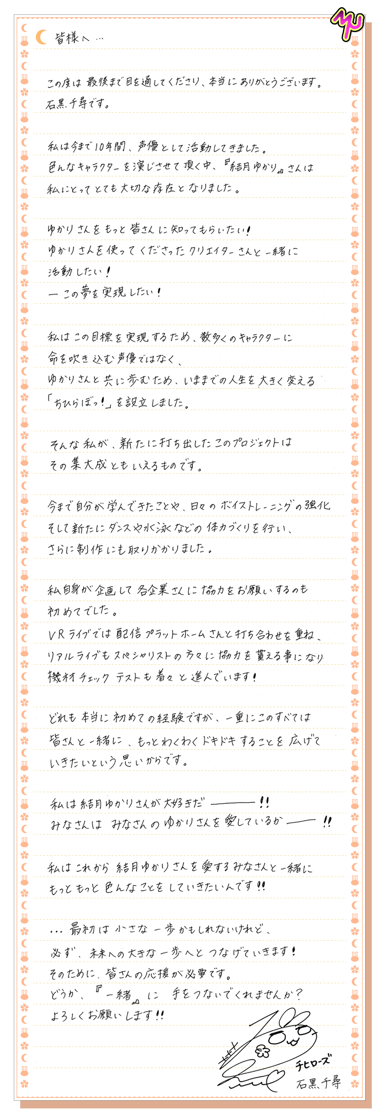 私も結月ゆかりを愛する、いちユーザーとして、ユーザーの皆さんと一緒に手を取り合いボーカロイド、ボイスロイドを愛する皆さんと一緒にさらに楽しい企画を考えていけたらと思っております。