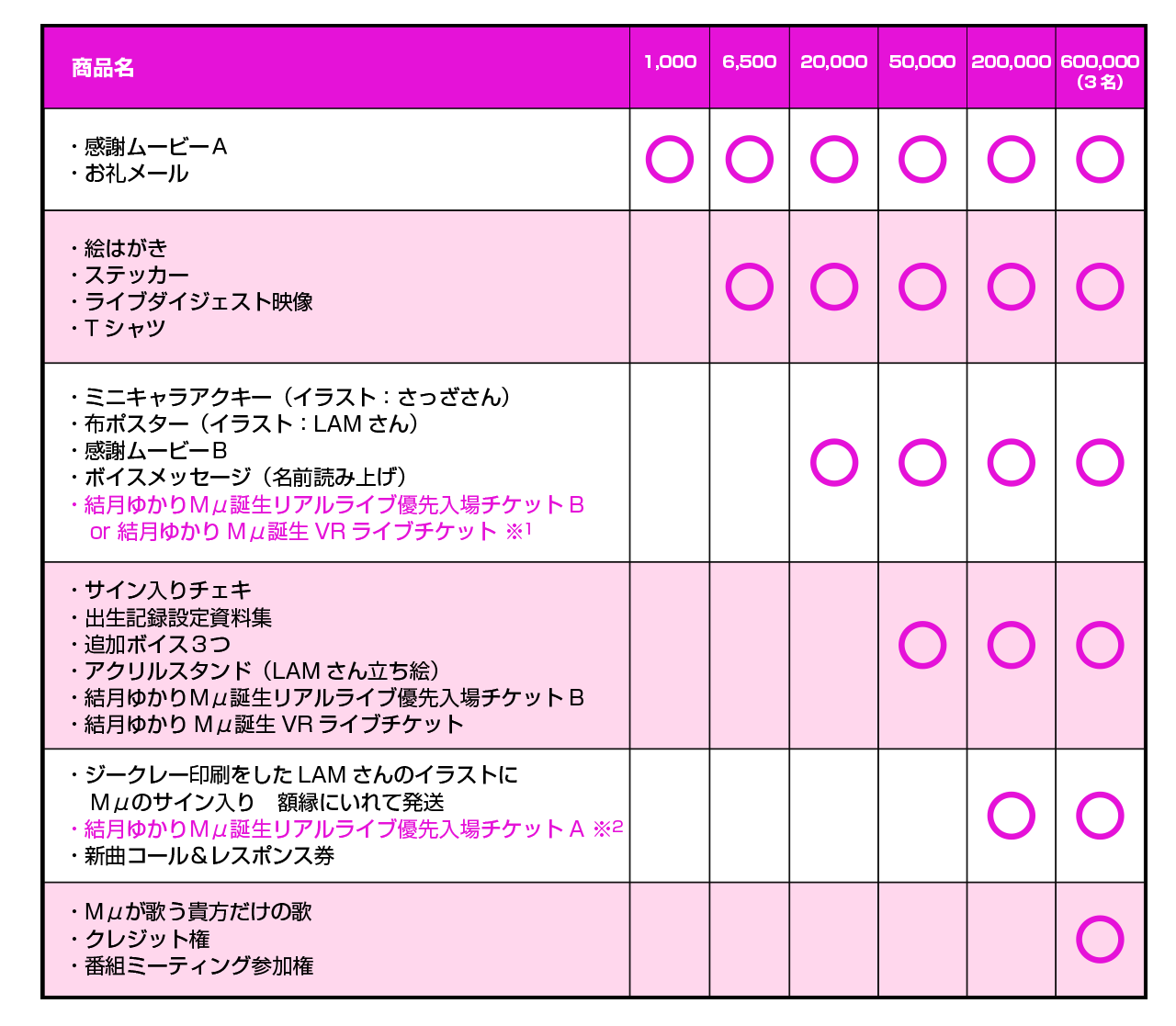※1:「結月ゆかりΜμ誕生リアルライブ優先入場チケットB」と「結月ゆかりΜμ誕生VRライブチケット」のどちらかが選択できます。