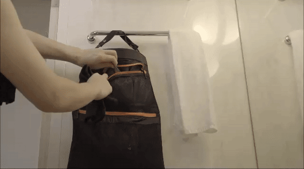 On the GOバッグ2.0を広げて、ホテルのバスルームや洗面所に取り付けると小物用クローゼットに変身!取付け方もスナップを留めるだけでとっても簡単!