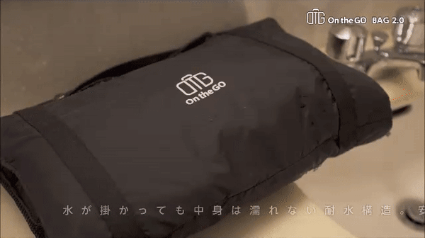 On the GOバッグ2.0は耐水素材でできており、水がかかっても中身は濡れません。安心してバスルームでも使うことができます!