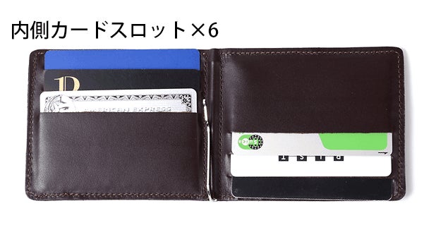 収納スペック:札ばさみ×1、内側カードスロット×6、外側カードスロット×1(1枚~3枚程度収納可能)