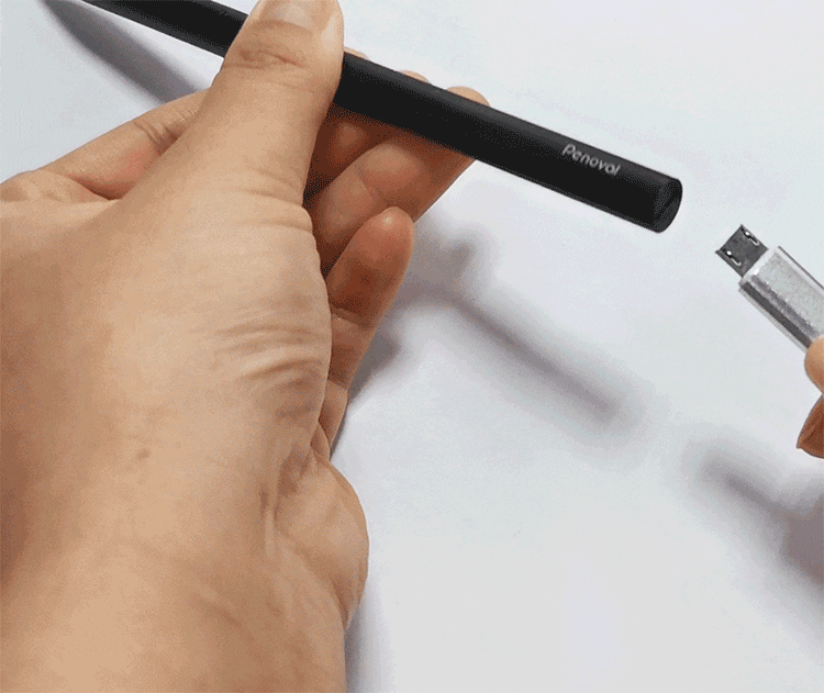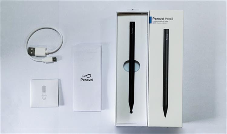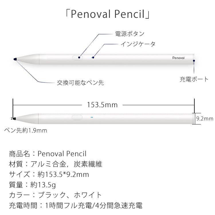 ▲「Penoval Pencil」1セットにつき、本体1本、マイクロUSBケーブル1本、交換用ペン先1点、取扱説明書1枚が付属します。