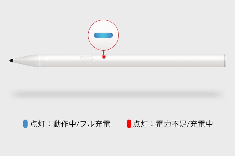 20分操作がないと自動的にスリープするため、充電する回数も少なくなります。電源ボタンの上にLEDインジケータがあり、作動中は青色に点灯します。電量が少なくなってくると、赤色に点灯しますので充電してください。