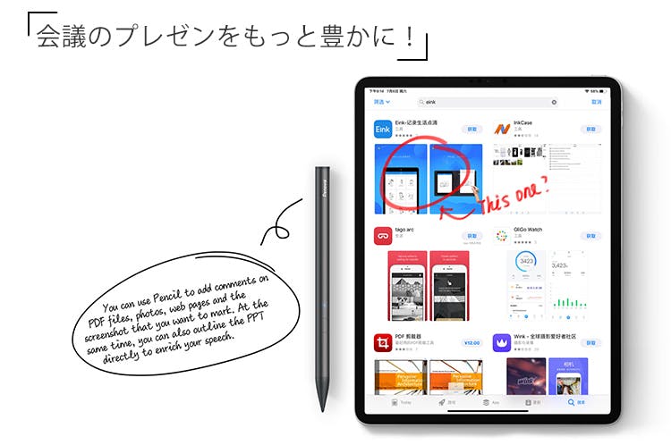 2018年以降に販売されたすべてのiPad(※iOS 12.2以降)に対応しています。さらに100以上のアプリにも対応!たとえばNotability、Sketches、Writing Wizard、Keynote、Adobe Lightroom CCなど・・・さまざまなアプリを自由にお楽しみください。