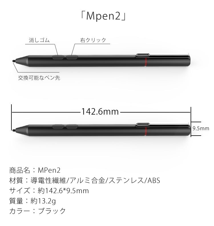 ※Microsoft純正のペン先が2つ付属します(その中の一つは本体に装着の状態で)。