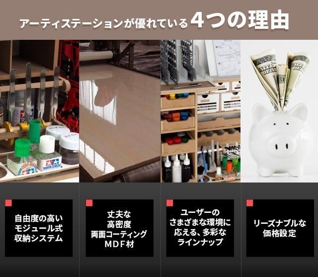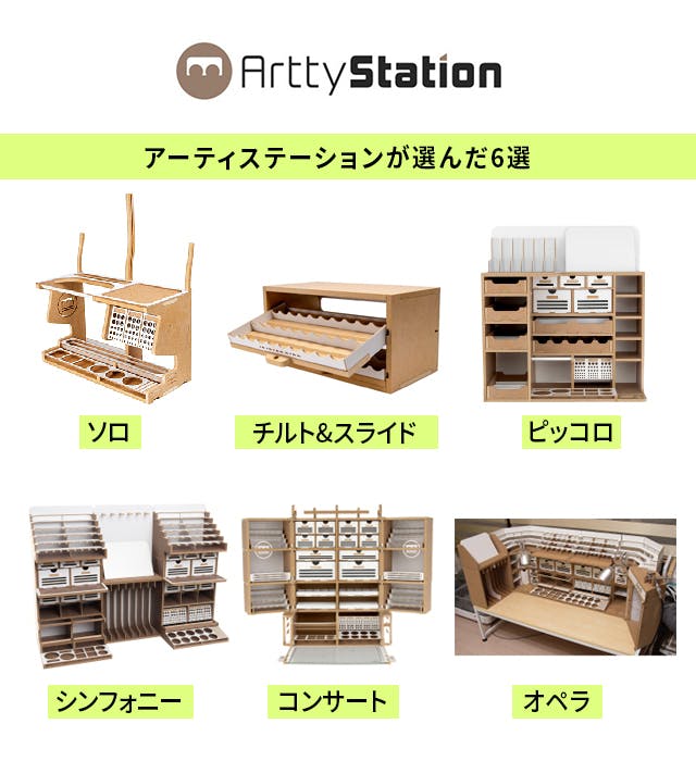 趣味のための専用空間作りが難しいとあきらめてしまった方や、ホームセンターなどで収納グッズを揃えてDIYしてみたものの、規格やサイズが違うためにきれいに道具を収納できず、現状に満足していない方、本格的にプラモデラーになりたい方々に「Artty Station(アーティステーション)」はおすすめです。