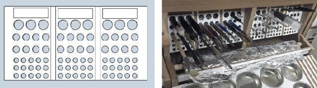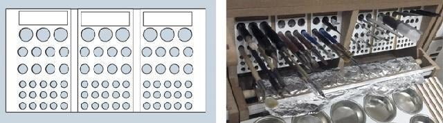 合計114個、たっぷりと備え付けられたホールは、塗装用ブラシ、ウェザリング用ブラシ、調色用のツール、ピンバイス、ナイフ類など、多彩な種類のツールを、大・中・小サイズの3種類のホールサイズで収納できます。大量のツールを収納しても、複雑にならずに便利に使用可能です。