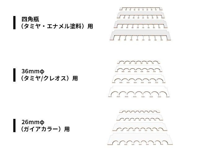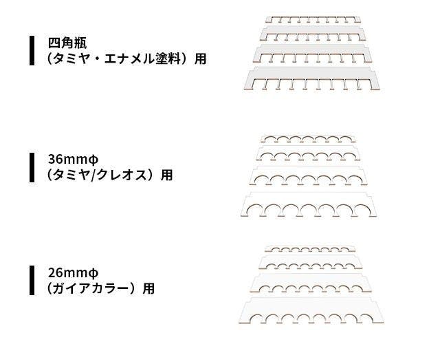 塗料ラックには各メーカーの容器に合わせてそれぞれ専用のパーツが付属しています。