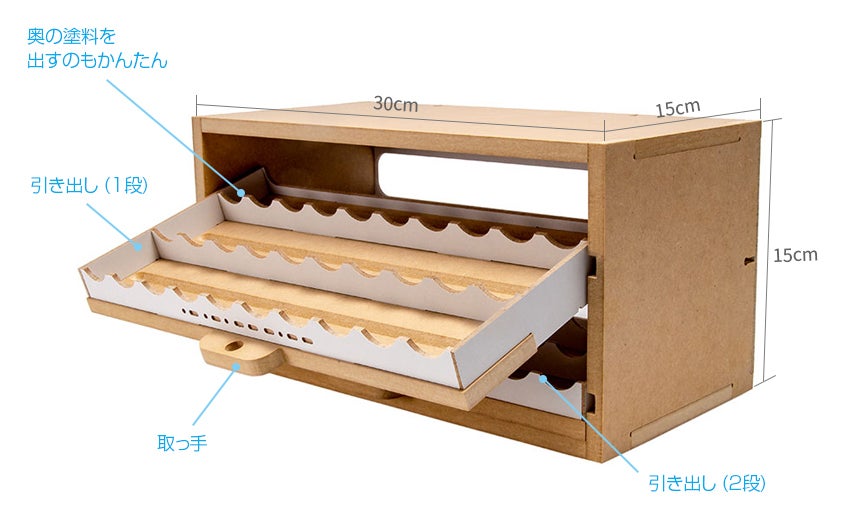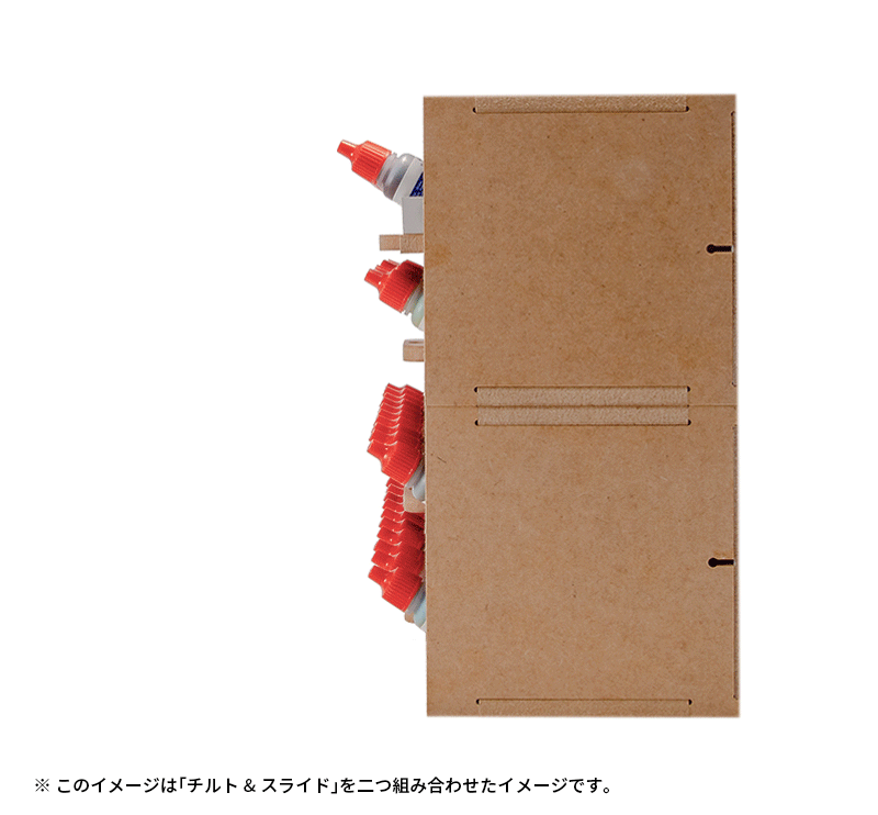 「チルト&スライド」は、引き出し式スライド塗料ボックスです。幅30cm × 高さ15cm × 奥行き15cmという小さなサイズにたくさんの塗料ボトルが収納可能。棚が傾斜し塗料を抜き出しやすく設計されたアイデア引き出しです。