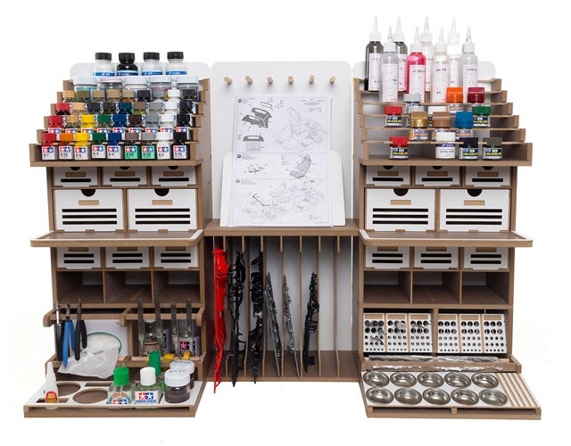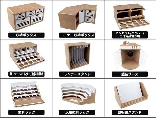 ニッパー・ピンセットハンガー、ランナースタンド、説明書スタンド、塗料ラック、収納ボックスなど、プラモデル製作に必要な収納スペースが一通りそろうセットです。