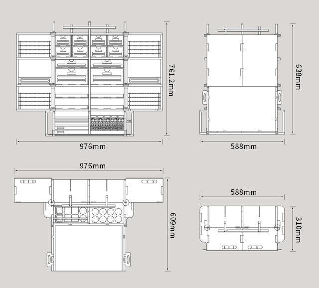 扉を開いた状態では、横幅976mm 奥行609mmの大きな収納ラックですが、観音開きの扉を閉じると横幅 588mm 奥行310mmまでコンパクトにすることができます。