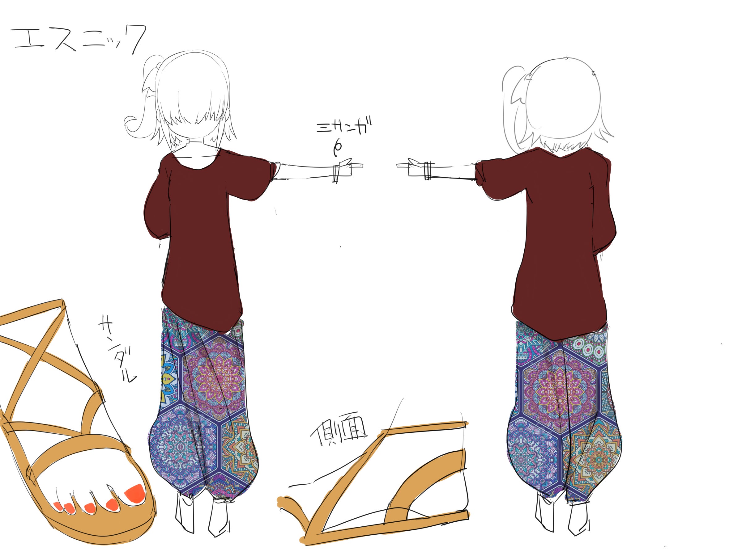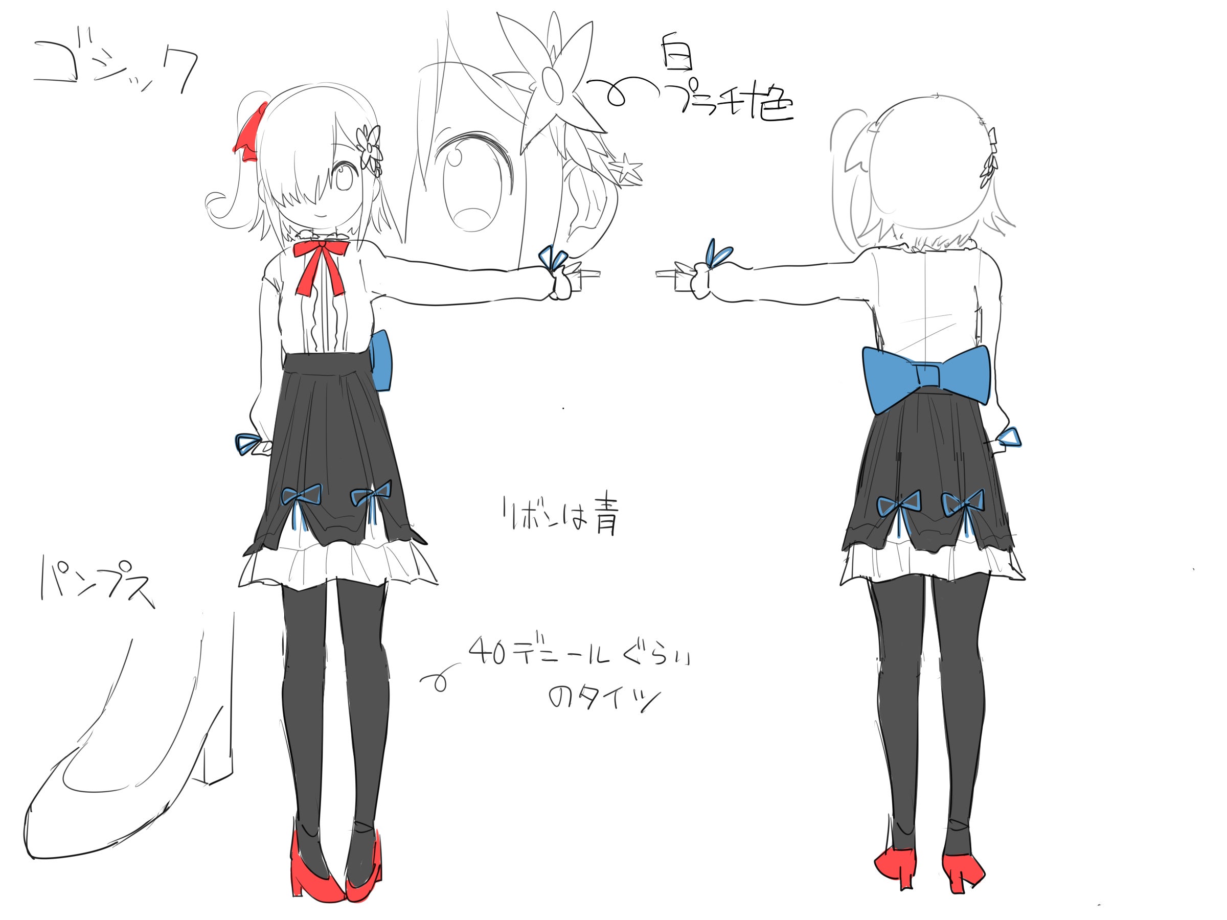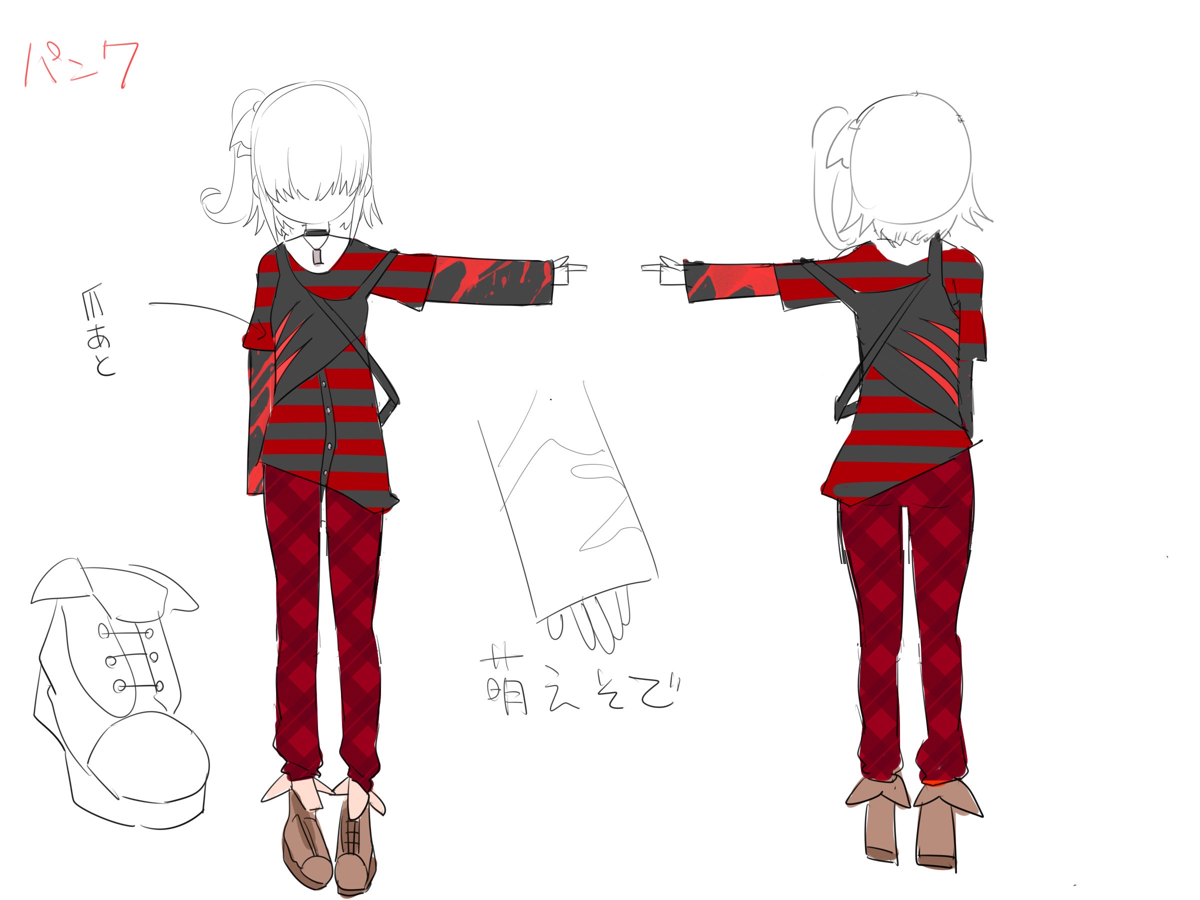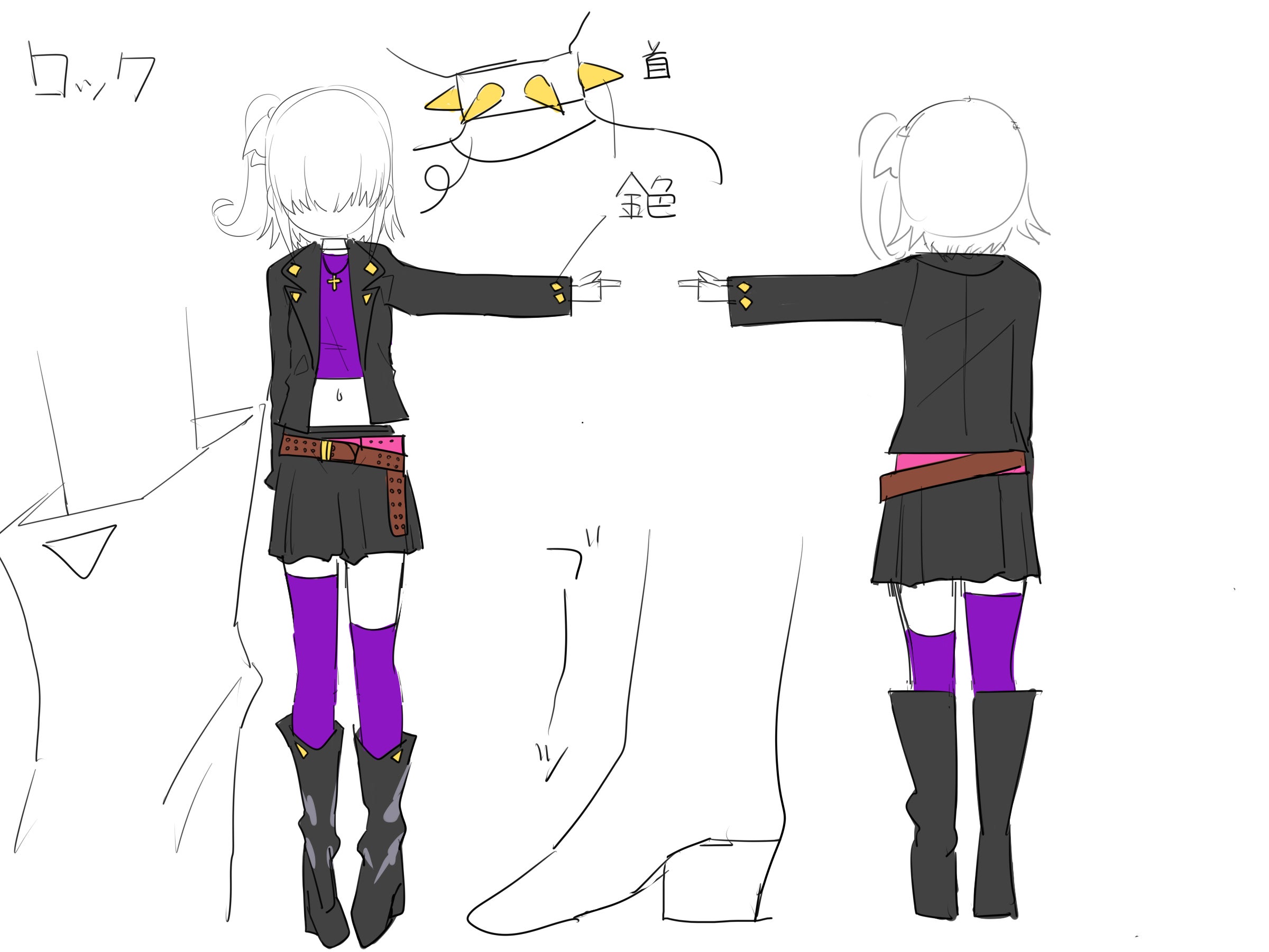 今回の曲のタイトルが「虹コスチューム」というタイトルで、どんな衣装も臆せず着てみよう。といった意味を込め様々な衣装を蟻塚暗都ちゃんが着ていくといった内容ですので、そのMVに使用される衣装の一部のデザインを掲載させて頂いています。