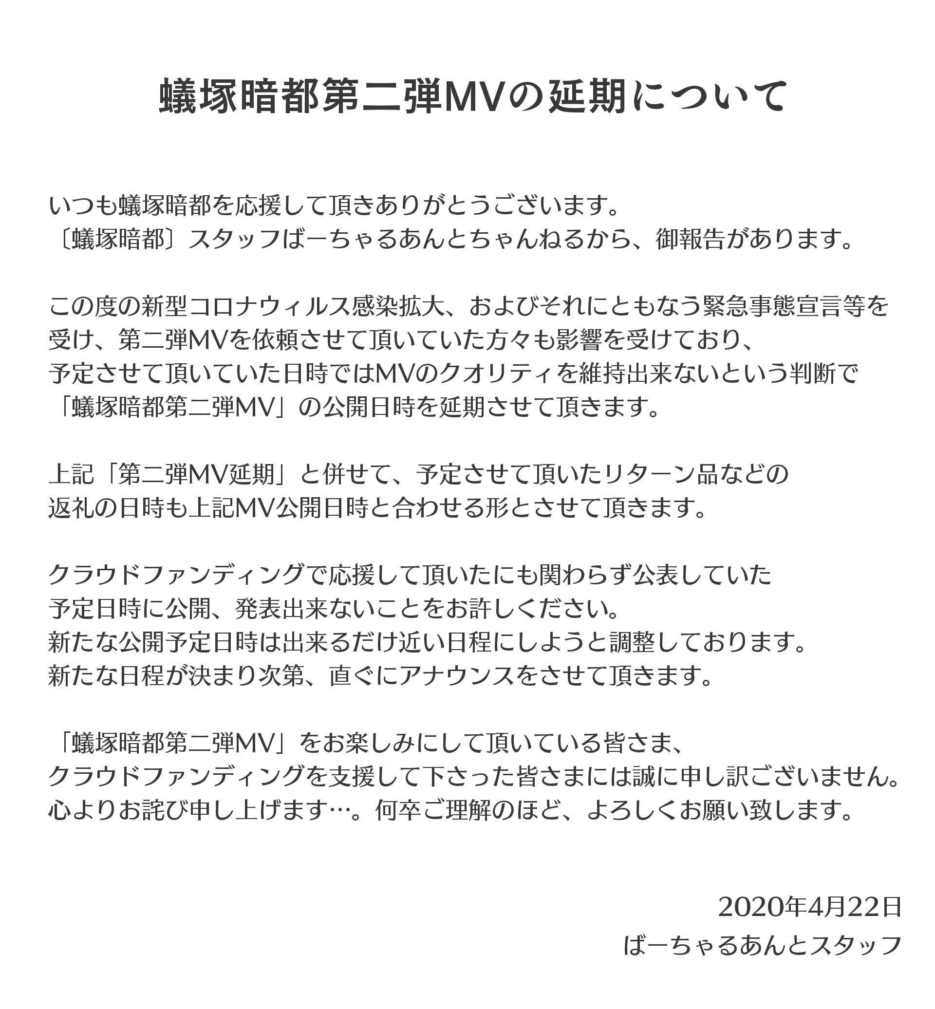 「蟻塚暗都第二弾MV」の公開日時を延期させて頂きます。
