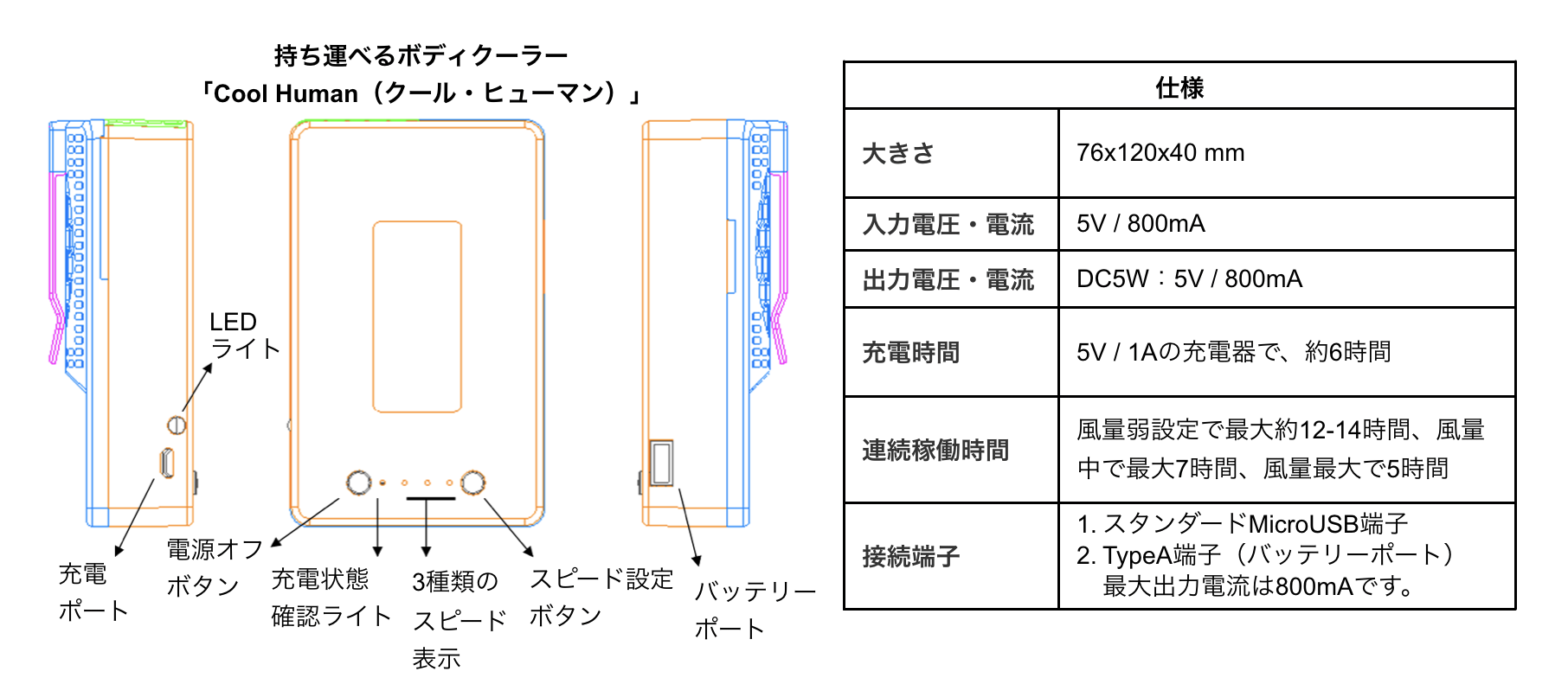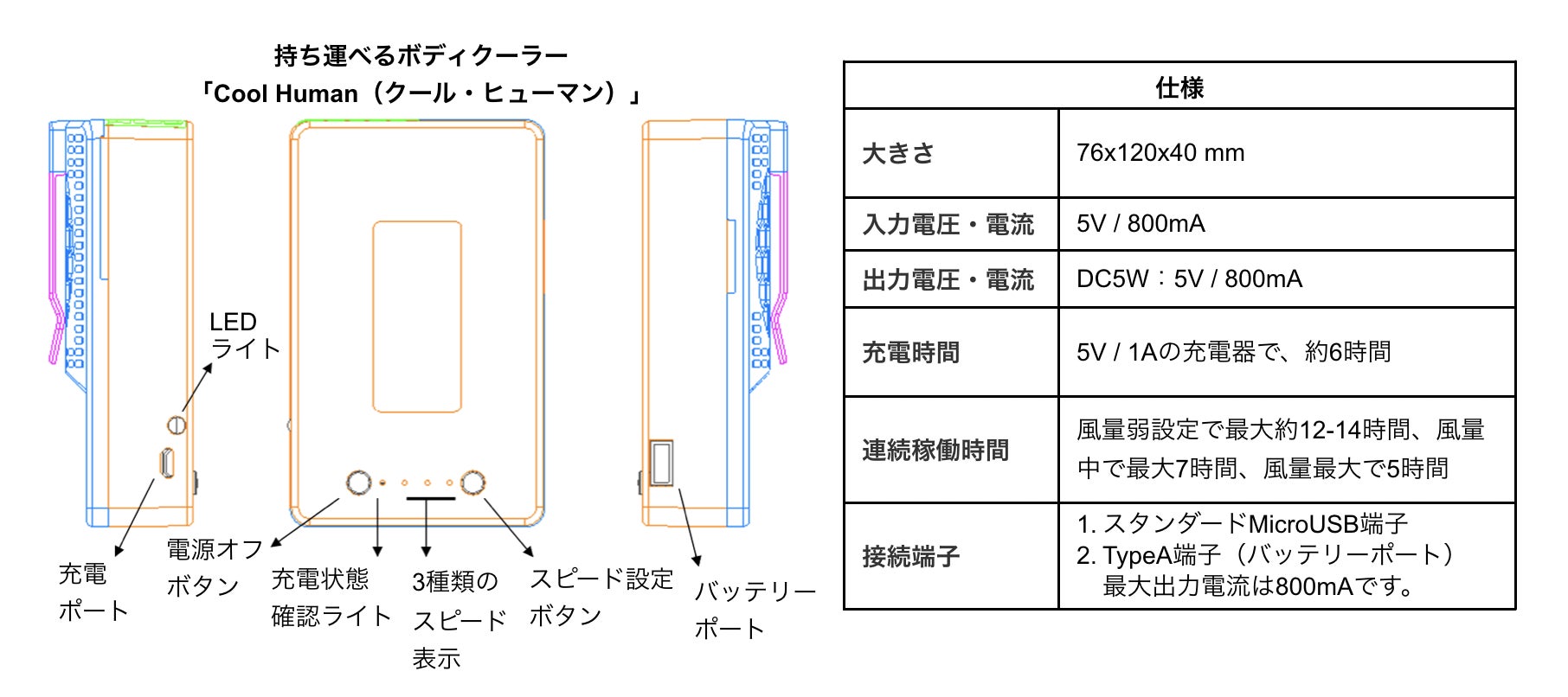 持ち運べるボディクーラー「Cool Human(クール・ヒューマン)」 の仕様は下記の通りです: