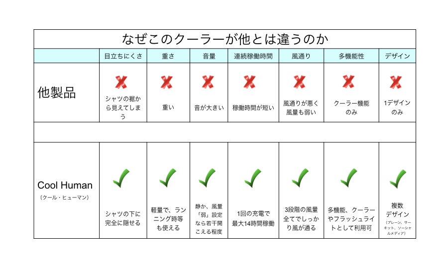 持ち運べるボディクーラー「Cool Human(クール・ヒューマン)」 と他のウェアラブルクーラーの主な違いは、下記の通りです。