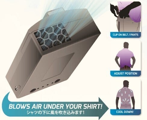 そんな時でも、この持ち運べるボディクーラー「Cool Human(クール・ヒューマン)」があれば、衣類の下で風の通り道を作り、風のない湿度の高い場所でも人間の気化冷却機能の効果を発揮させることができます。