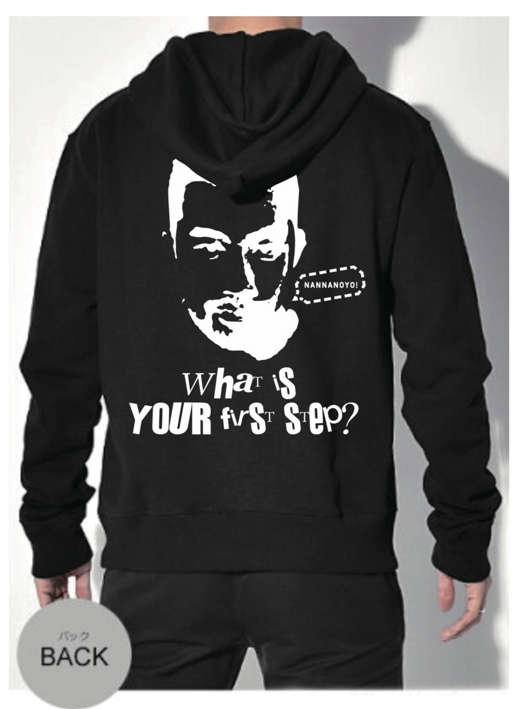 今回リターンとして制作するTシャツとパーカーのメッセージは、What is YOUR first step?