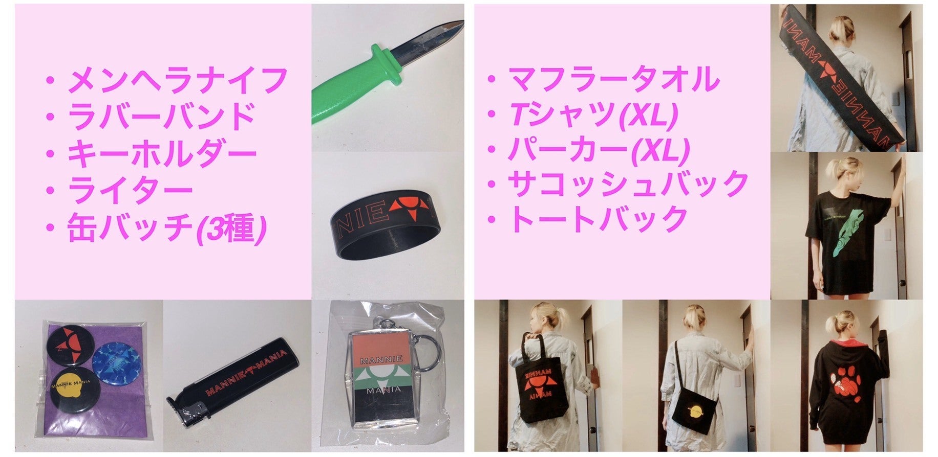 ・Mannieグッズ全種類...メンヘラナイフ、ライター、ラバーバンド、缶バッチ、