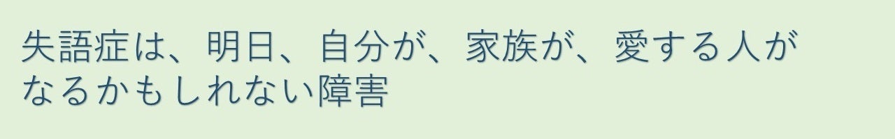 失語症は外見からはわからない障害の一つです。日本全国には、およそ50万人超の失語症のある方がいます。脳卒中や脳外傷、脳炎等が原因で、脳の前頭葉言語野が損傷されて失語症状を呈します。言いたいことが浮かばなかったり、思ったことと違うことを言ってしまったりする等の話す側面、聞こえているのに言葉の意味が理解できないなど聞く側面、更に、声を出して読むことも困難となり、声を出して読めても意味が解らない、数字が理解できない等の症状もあります。話す、聞く、書く、読む、計算する等に大なり小なり困難を生じる障害です。社会的動物である人間の「ルール=コミュニケーション」が困難になります。言葉を失うことは、社会との接点が希薄になり、孤独になり、孤立します。失語症という障害を社会の多くの方にご理解いただくために、「失語症の日」を制定し、失語症があっても、家族と一緒に日々の生活を楽しみ、社会参加ができる等、当たり前の生活ができる「ユニバーサル社会」日本を目指します。