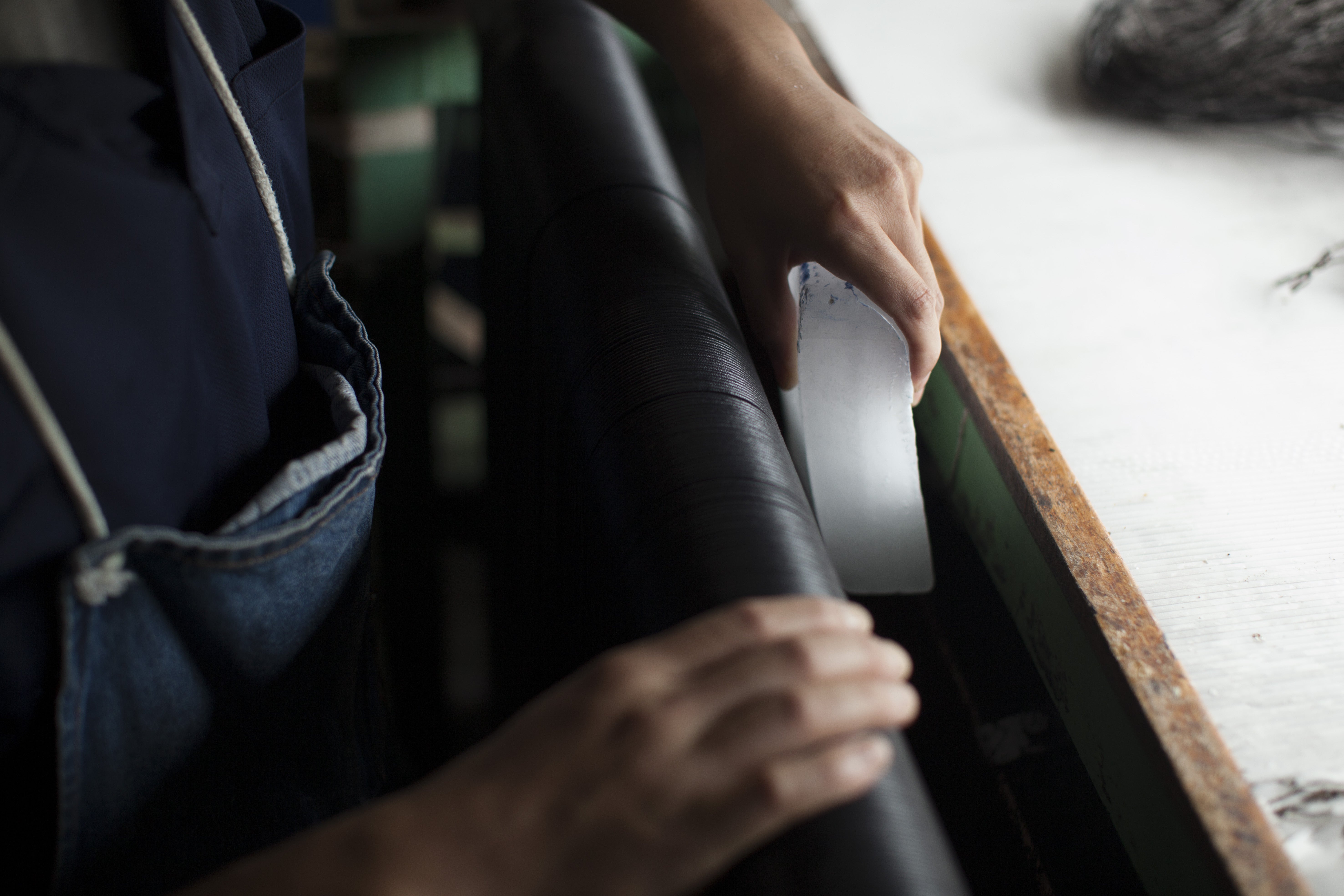 更に靴紐に巻かれている帯は、自社で職人が一枚一枚丁寧に蝋をコーティングしてワックスペーパーを手作りしています。あえて皺をつけ同じものが一つとないように仕上げています。