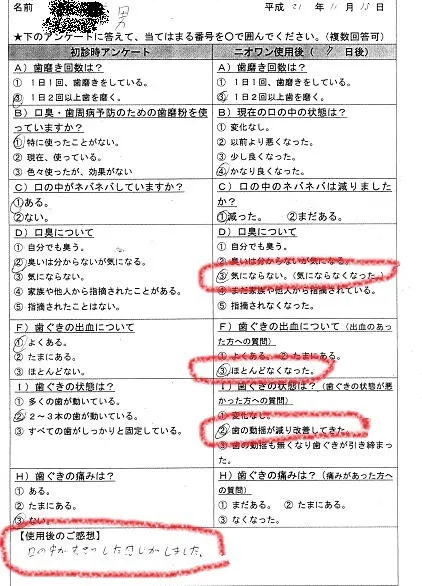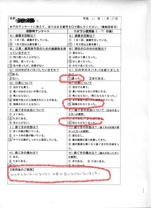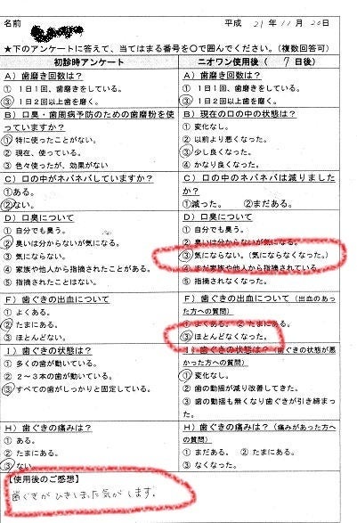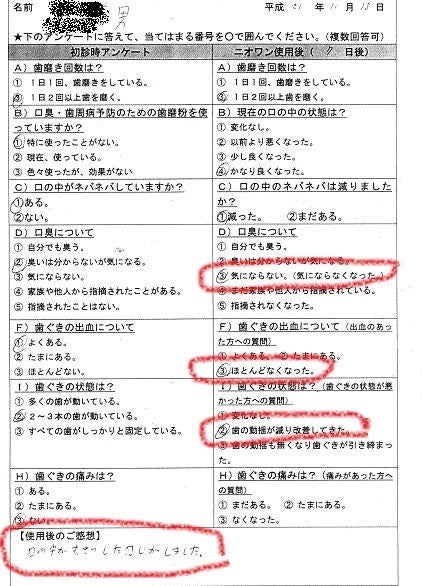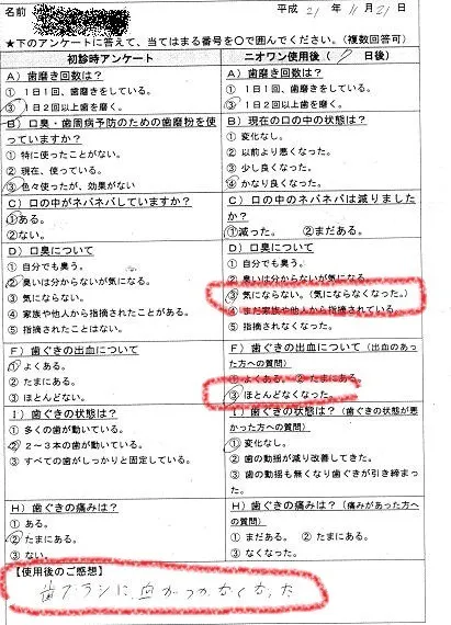 1週間から2週間という短いモニター期間でしたが、「歯がツルツルになった。」「口臭が改善した。」「朝起きた時、口の中がすっきりしている。」「歯茎が引き締まった。」それどころか、「歯茎からの出血がとまった。」という方もおられました。