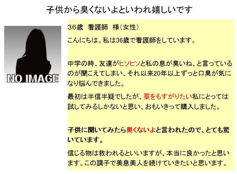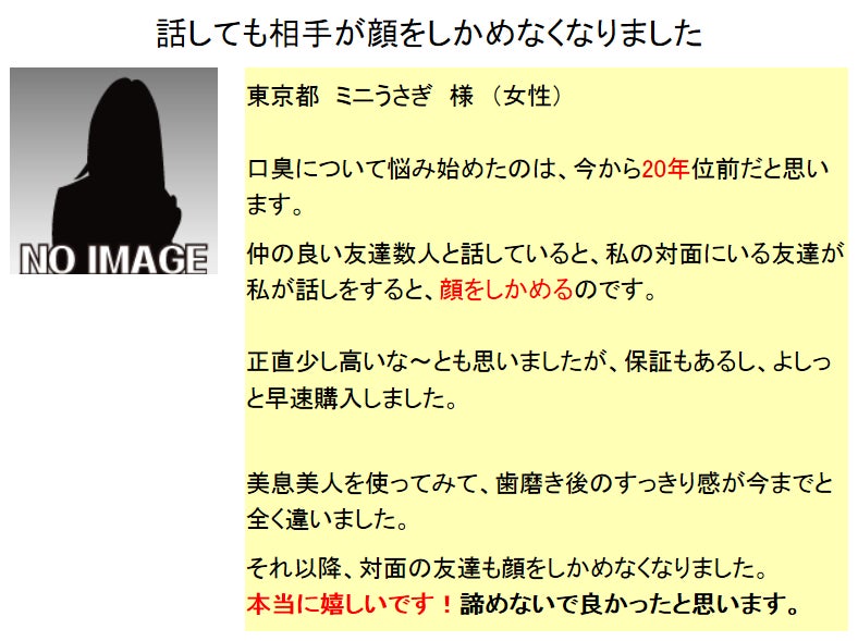 心が折れそうになった時、私を救ってくれたのはモニターの方からの感謝の声でした。「今まで一向に口臭が治らなかったのですが、美息美人を使用してから口臭が改善されました。」(個人の感想です。)