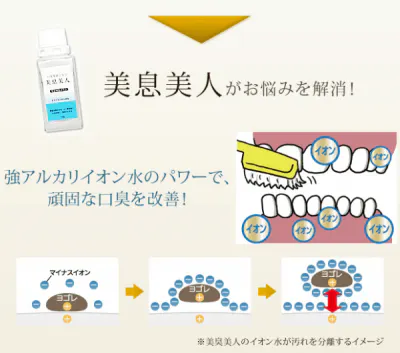 「口臭が治らない」のは、舌と喉のケアが出来ていないからです。完全に口臭をシャットアウトするには、、、歯周ポケット内のプラーク、舌苔、喉の粘液、を取り除く必要があるのです。それを期待できるのが、美息美人のアルカリイオン水です。