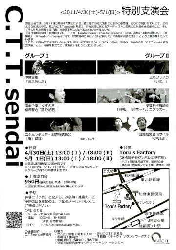 C.T.T. sendaiとは、「Contemporary Theater Training=「現代演劇の訓練」として、仙台市内で月に1回のペースでワークショップをしたり、トレーニングの成果を発表する場としての「試演会」を行なっている団体のことです。http://cttsendai.jugem.jp/?eid=15