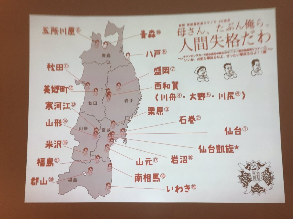 ミサイル20発目「『 母さん、たぶん俺ら、人間失格だわ 』~キャンピングカーで巡る真冬の東北二十都市挨拶周りツアー♨ いいか、お前ら事故るなよ、ぜったい事故るなよ!!編~」のツアーマップ。タイトル長い(笑)