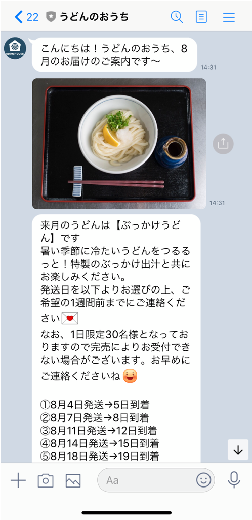 UDON HOUSEの宿泊営業も夏から再開する予定なので、製麺ができるのは今のところ週に2日。1日に作れる量は30名様まで。火曜日と金曜日に麺を作るので、みなさまのライフスタイルに合わせてご希望の発送日を選択してください。週と曜日は毎月変更してもOK、毎月第二金曜日と固定してもOK。やりとりはLINEで気軽に行っていただけます。