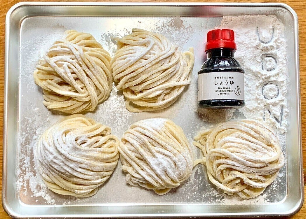 UDON HOUSEでは、お食事の代わりにご自身で打ったおうどんを召し上がっていただくので、私たちは1泊5玉、と呼んでいますが、今回『うどんのおうち』では、皆さんの代わりにUDON HOUSEのスタッフ、うどんナビゲーターが作ったうどんを5玉分BOXに入れて皆様のご自宅に届けます。