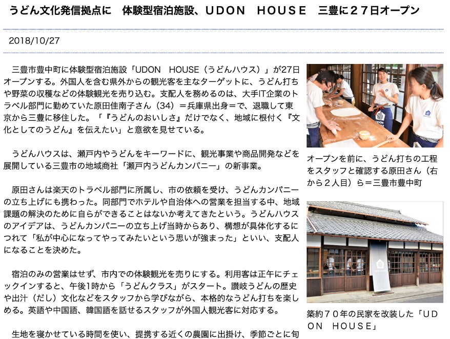 こんにちは。香川県三豊市で、うどんを打たなきゃ泊まれない宿「UDON HOUSE」を運営しています瀬戸内ワークス株式会社代表の原田です。