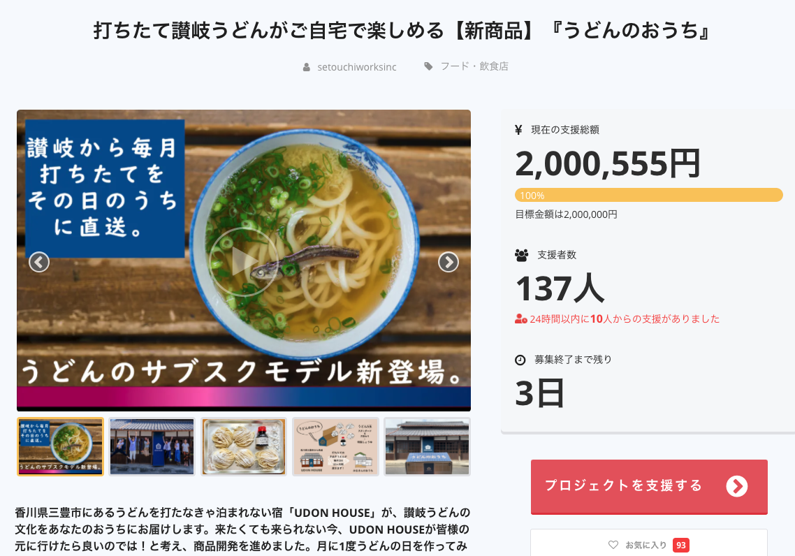 こんばんは。クラウドファンディング最終日、残り2時間を迎えました。本当にたくさんの、180名もの方からお申込を頂き感謝の気持ちでいっぱいです。今回、うどんのおうちを始めたきっかけはやはり、新型コロナウイルスでした。顧客ターゲットが海外の方であるUDON HOUSEの宿泊予約は3月には既に壊滅的。2018年10月開業以来、良い時期も苦しい時期もありながらようやく安定した1年を迎えることができるか否か、という矢先のことでした。正直、今年にかける思いは強かっただけにどうしようもない状況に肩を落としましたが、落ち込んでいてもしょうがない。幸い、若い組織ゆえ変化には強いのが長所であり、いかにこの逆境を捉えるかが経営者として問われていました。とは言え、宿泊業は予約が入る度にお受けして良いものかと悩む日々。スタッフの安全、地域住民の方への配慮、何かあったときの風評被害、色んなことを考えれば考えるほど、出せる結論は「予約を取らない、お客様を受け入れない」という答えにしか行きつかないことが判明。しかし、このまま営業ができないままでは会社としての存続が難しくなります。なんとか、コロナに影響されない事業の柱を作らなければならない。そう発想したのがこの「うどんのおうち」です。UDON HOUSEが提供してきた価値が何であったかを振り返り、私たちが成し遂げたいことを再確認。お客様が移動できないとなれば、どんなサービスが有り得るのか。毎日スタッフと議論を重ねて生まれたのが「うどんのおうち」です。やりたい世界観と表現方法、現場のオペレーションを考えた現実性、それぞれが得意な分野を生かして妥協せずにこだわり抜く。日々変化する情勢の中、昨日決めたことを今日覆し、先週と今週で言ってることが異なり、、、というストレスの中、スタッフ一人ひとりが本気になって向き合ってくれたと思います。私にとってはそのことがまた、とても大きな財産となりました。今なお、宿泊業はGOTOキャンペーンはじめ様々な情報に振り回されています。緊急事態宣言が解けて、県をまたぐ移動が許可されたタイミングで受け入れた予約も、実際の宿泊日が迫るにつれて状況が一変。果たして、この予約を受け入れて良いものか。毎回毎回、同じ様な悩みに時間と労力を取られるよりも、新たなものを生み出すことにエネルギーを使う方が良いのではないか。うどんのおうちは、コロナがくれた大きな財産です。まずはプロジェクト達成の喜びをスタッフと分かち合い、そしてこの気持ちを忘れずに皆様の元へお届けして参りたいと思います。本当に、本当にありがとうございます!!原田佳南子
