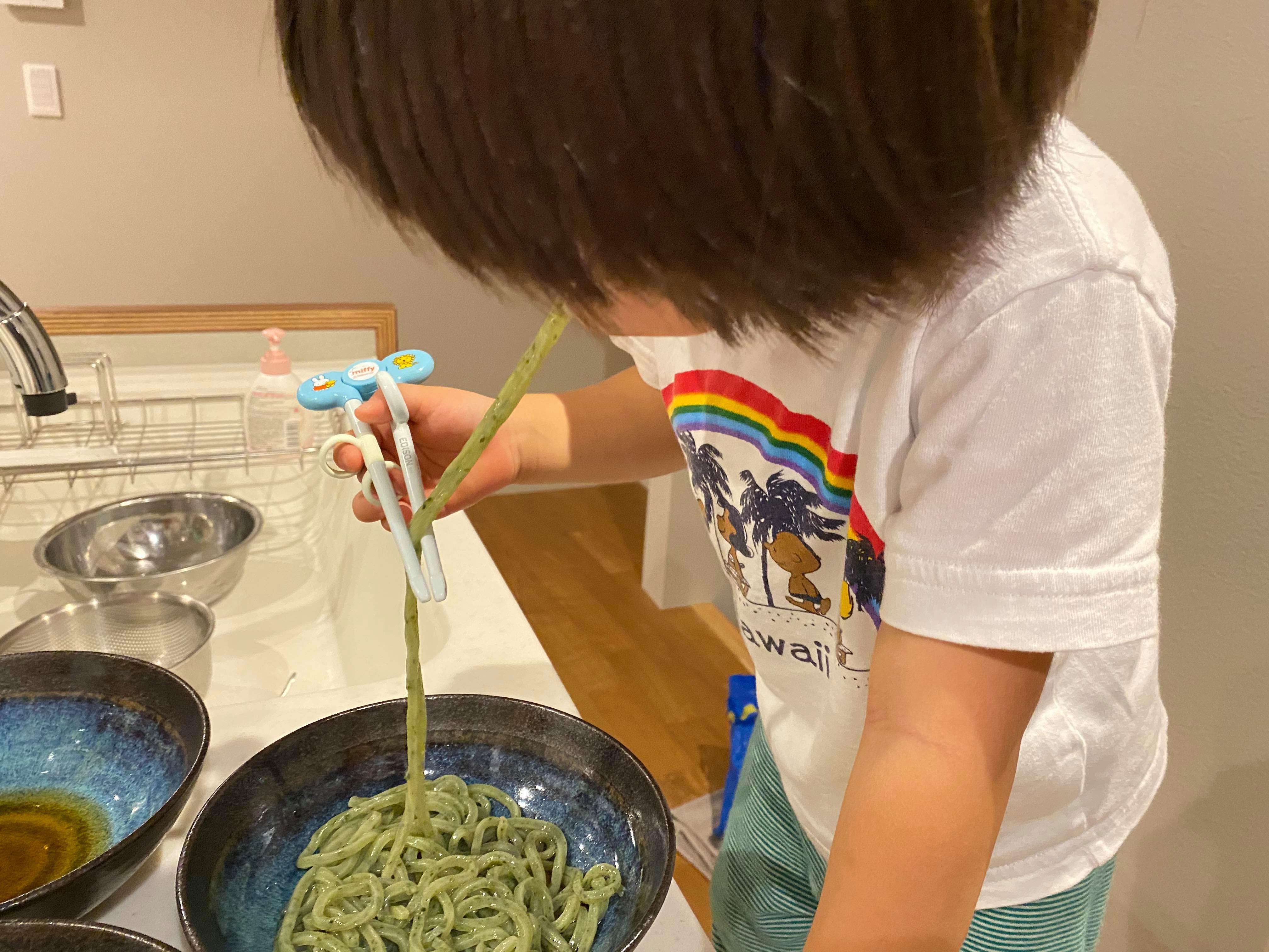 お箸の練習も兼ねて、わかめうどんをツルツルっと。上手に食べてくださってますね!