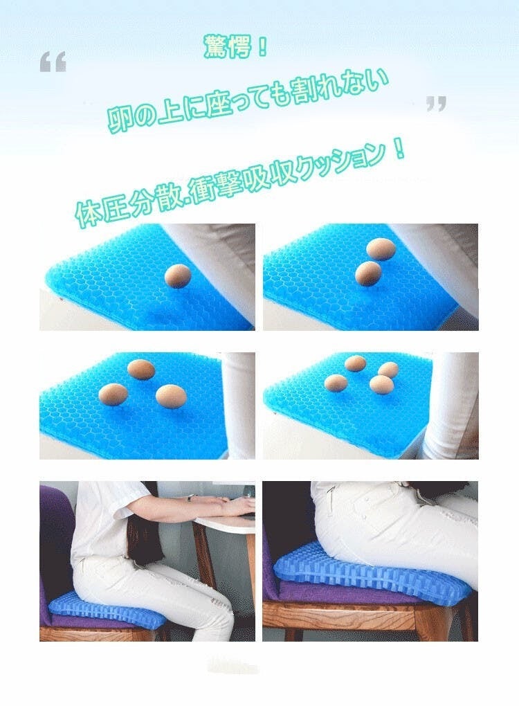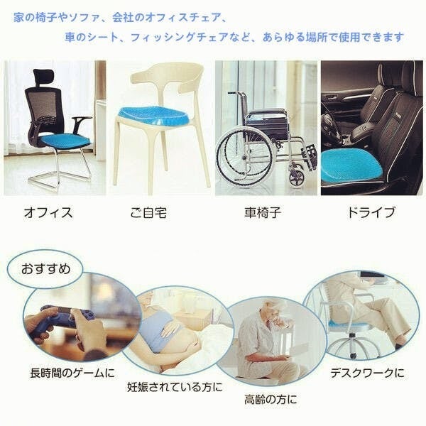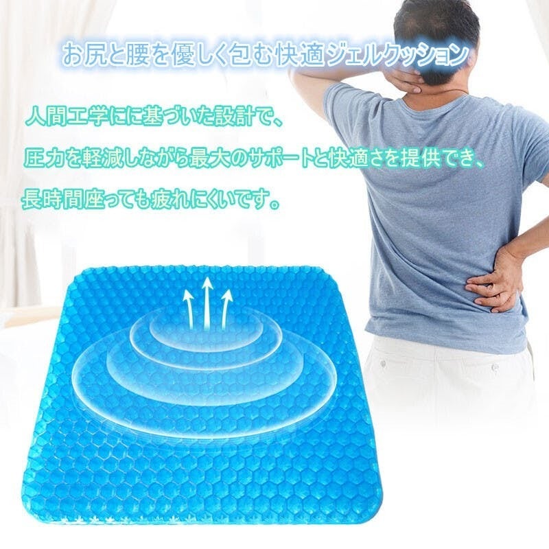 職場での使用に購入いたしました。最近デスクワークが多くなり長時間座りっぱなしになることが多くお尻が痛くなってどうしても集中力かけます。それまでは低反発のクッションを使用していました(東急ハンズとかで売っている中央に穴が開いたドーナツ型のまあまあ高価なやつ)がやはり長時間使用していると効果が薄れます。まだ使用して間もないですが低反発のクッションとは全然使用感が違いますし、座っていてもなんとなく気持ちがいい感覚です。第一印象はかなりよかったし、周りの方もジェルクッションに興味がある方も多くお試しで座りにきています。カバーにお滑り止めがついているためズレることなく快適に使用できます。今からは冬ですが低反発クッションは夏場はお尻が蒸れていましたが、ハニカム構造になっているため夏場にも快適に使えそうな予感です。母親も椅子に座っていると腰が痛いと常々言っているので買ってあげようと思います。