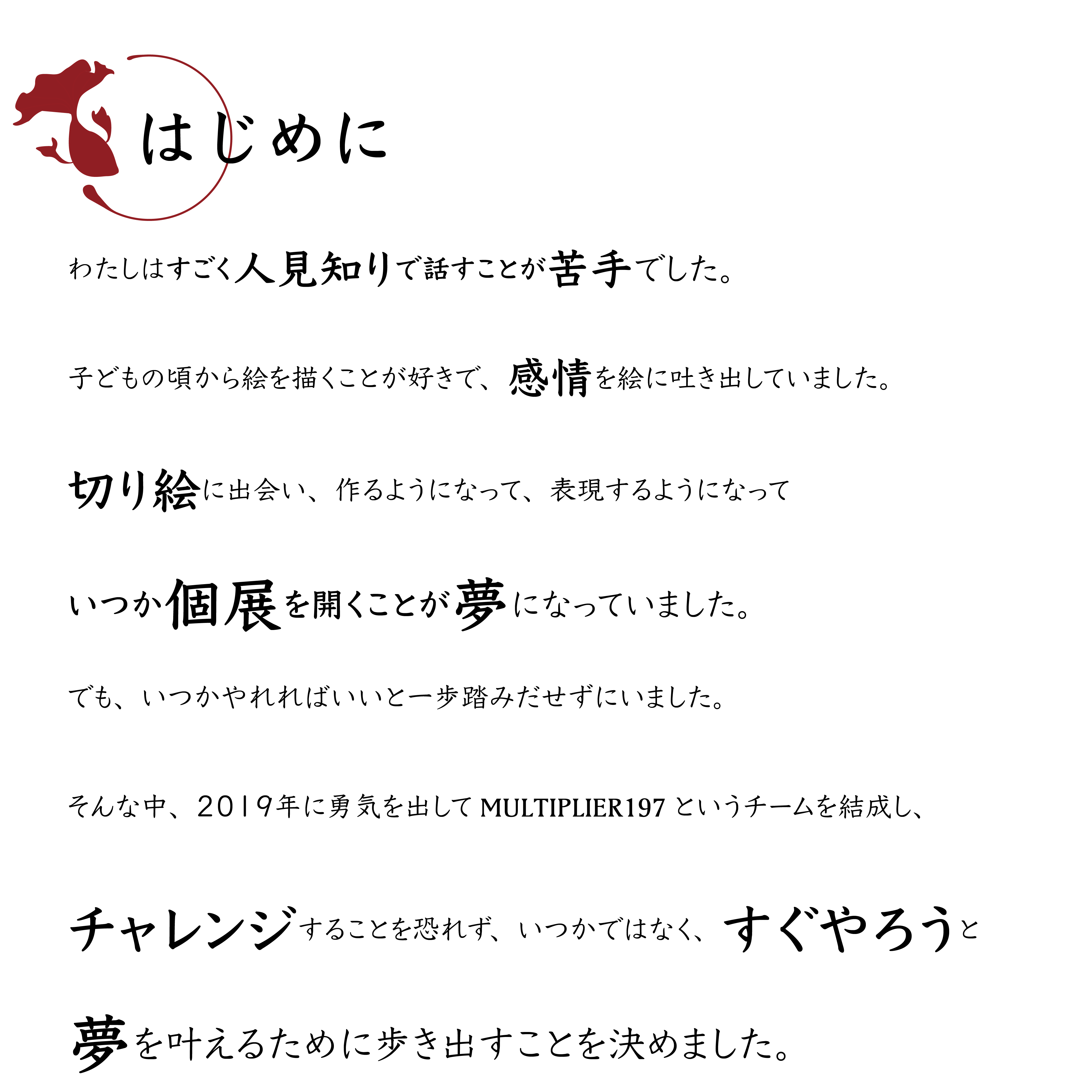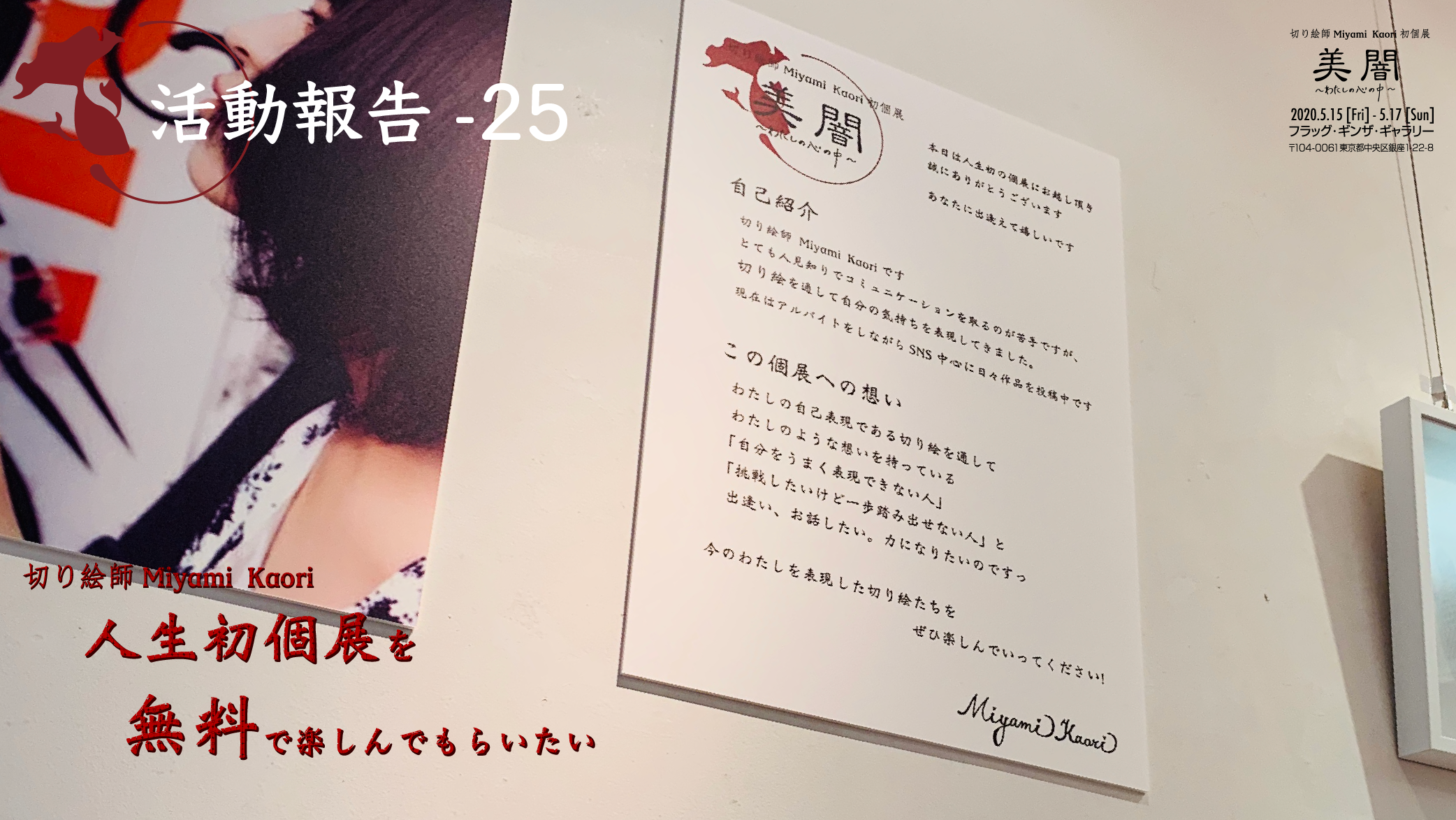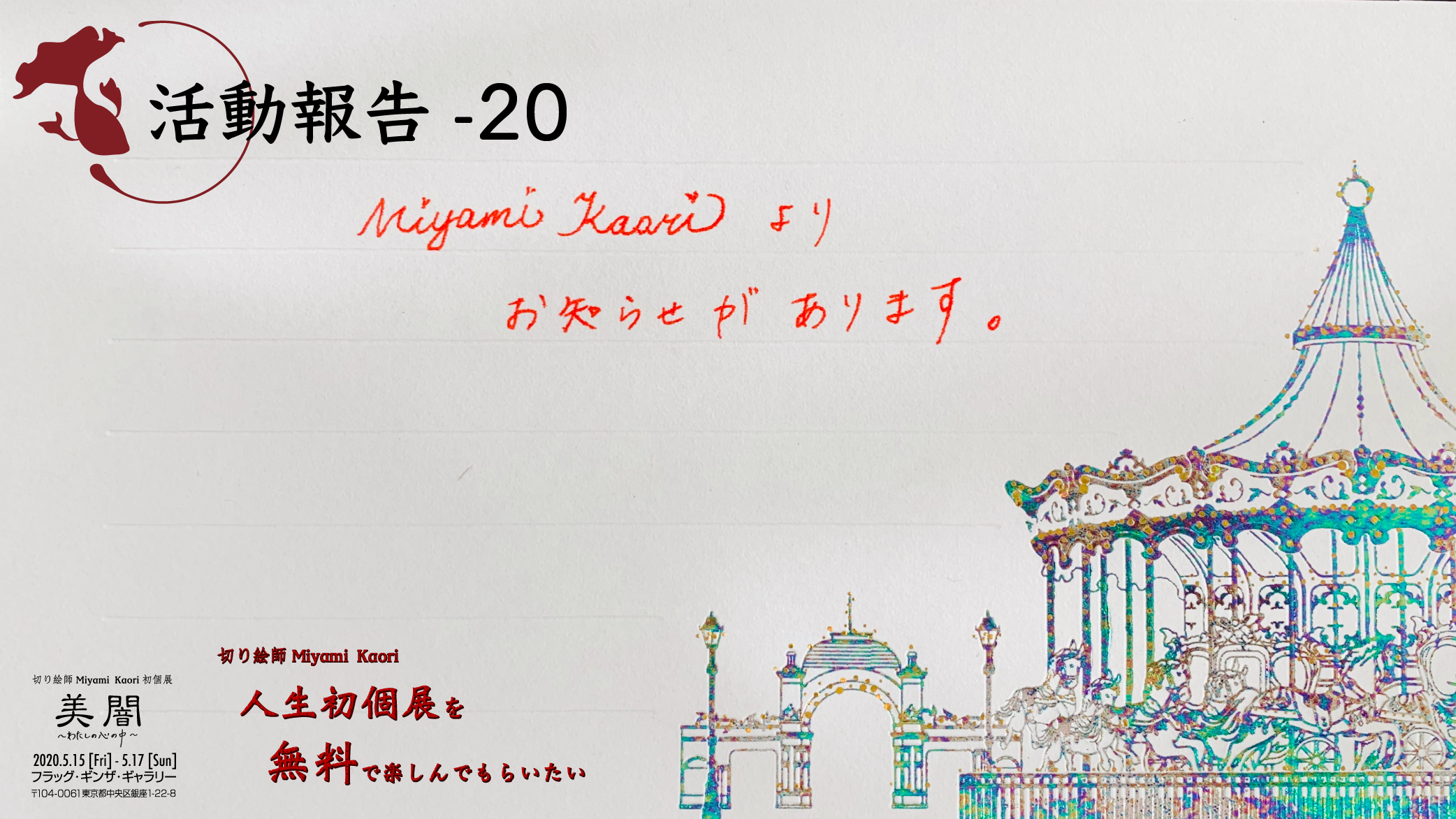 こんばんは。Miyami Kaoriです。本日はお知らせがあります。切り絵師 Miyami Kaori 人生初個展『美闇~わたしの心の中~』5月15日(金)〜17日(日) 11:00~19:00フラッグ・ギンザ・ギャラリー (東京都中央区銀座1-22-8)にて開催を予定しておりましたがこの度の新型コロナウイルスの影響を受け、大変残念ではございますが、中止とさせて頂きます。ですが無観客個展を開催致します。まず、中止とする経緯としては緊急事態宣言が予定通り5月上旬に終了したとしても開催日である5月中旬にはコロナウイルスが落ち着いてるとは言い切れません。また個展会場も少なからず密閉空間であると思いますし、大きい会場ではないので感染リスクはあると思います。そんな状況の中少しでもわたしを応援してくれる人をお呼びするのは心苦しいと思ったからです。そもそもこの個展を始めたきっかけは”あなた”と切り絵を通して出逢い、お話しがしたいです。この個展は"あなた"がいて初めて開催する意味があるのです。そして、"あなた"の人の命を脅かせてまで開催するのものではないと思い、中止という決断に至りました。ただわたしはこの個展をしたいという気持ちは変わりません。それにクラウドファンディングでご支援頂いたのにも関わらず中止というのは面目が立ちません。なのでどんな形であれ、この個展をお届けしようと想い人生初個展を無観客で開催することにしました!!無名の...人生初の個展が...無観客で...とんでもないことだと思います:( ;˙꒳˙;):展示した作品を動画で撮影・編集してYouTube等で配信し、お届けできたらと考えていますっ今、現在準備を進めている最中ですので是非チャンネル登録やSNSのフォローをぜひっ最後に改めましていつも応援してくださるあなたへこのような形になってしまい、申し訳ありません。楽しみにしてくださったあなたへごめんなさい。いつかまた開催するので来てください。クラウドファンディングでご支援頂きましたあなたへ本当に申し訳ない気持ちでいっぱいです。お借りした力を発揮することができませんでした。チームメンバーへいつも力を貸してくれていたのにごめんなさい。あなたに来てもらう個展は中止にしましたがあなたと出会える個展は形を変えて開催します。これが最善の策なのかはわかりませんがこれが今のわたしが出した決断です。どうか楽しみに待っていてもらえると嬉しいですMiyami Kaori