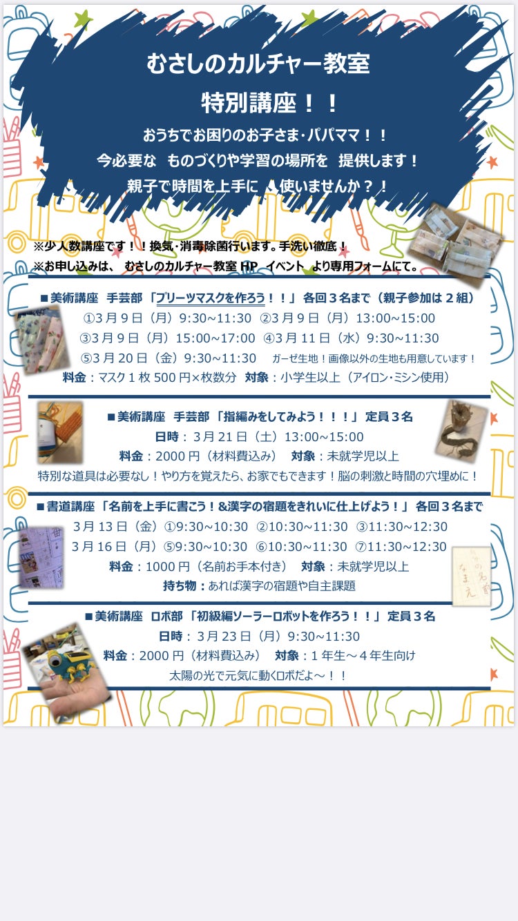 突然の休校措置。私たち講師陣をはじめ、働くパパママは頭を悩ませています。だからこそ、何か手助けはできないかと、特別講座を開くことにしました!※定員3名以下※換気、除菌、手洗い徹底※空気清浄機完備また、急ではありますが内容にもこだわりました。●マスク講座 →場所によってはマスクが義務。この状況が長引いたら、品薄状態にお困りの方も出てくるかと思います。●指編み講座 →やり方を覚えれば、お家でできる! 家の中ばかりでは飽きてしまうので、 時間を持て余すことなく脳も刺激。●ロボ講座 →ずっと家の中では飽きてしまいます。でも遊びに行くところも制限される。お庭で遊ぶときに、楽しく笑顔で遊べるように。●書道講座 →自分の名前をきれいに書く、漢字の宿題をきれいに書きます。休校になり、座って学習する時間が少なくなりました。座って丁寧に書くことで、集中力も持続できる。さらに一番書くことの多い自分の名前を、この機会にきれいにしましょう。そして宿題が出た学校があるものの、お家ではなかなか進まない。集中できる環境も提供します。