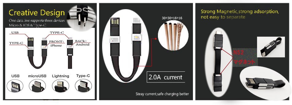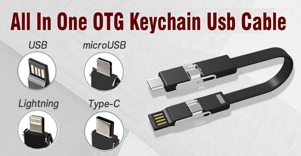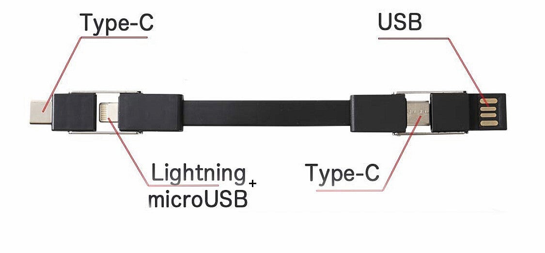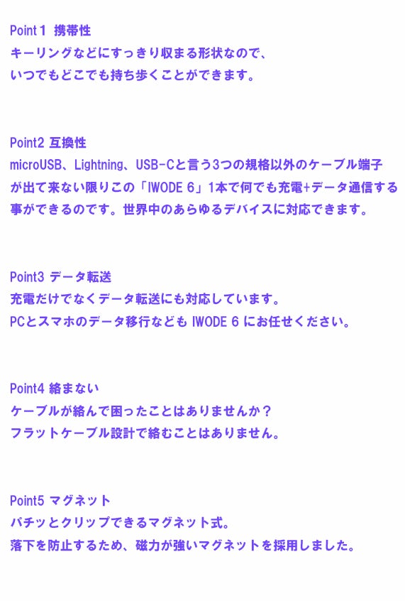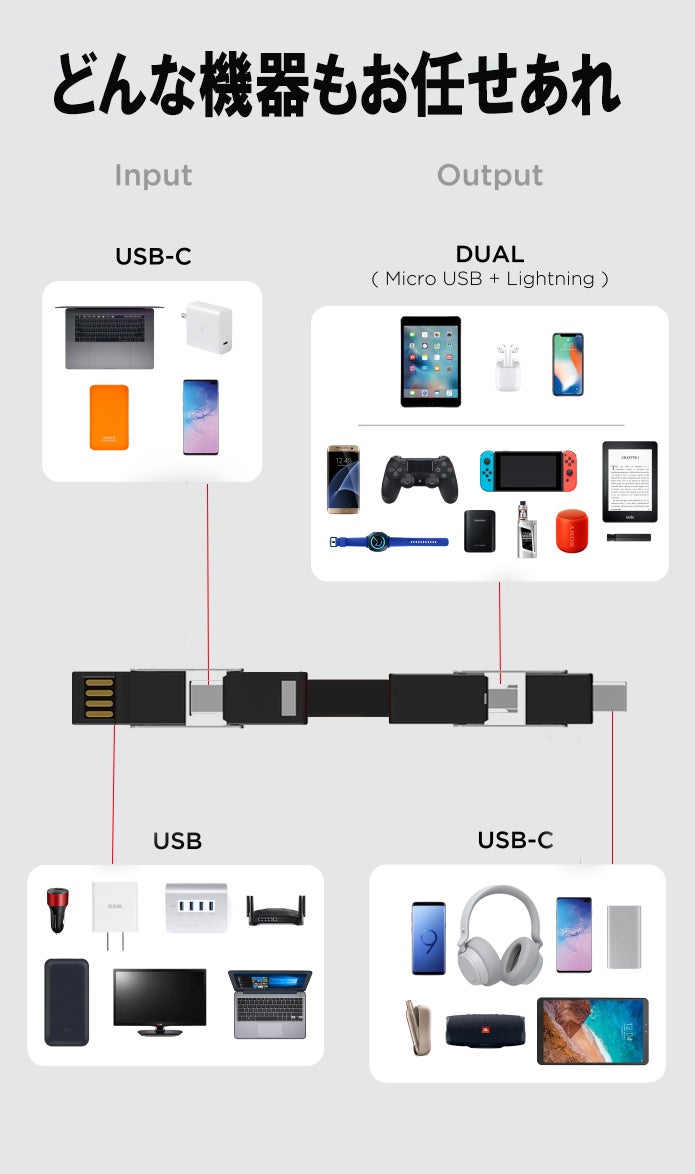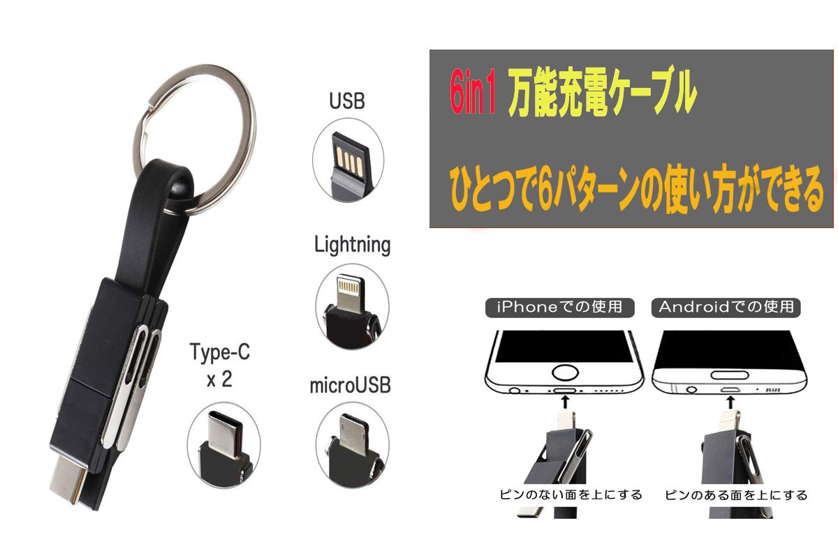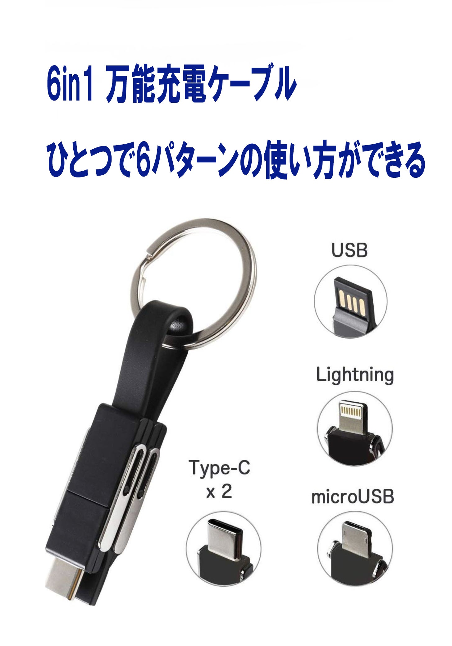 6パターンの使い方ができる万能充電ケーブル。キーホルダーサイズで持ち歩ける外出時の頼もしい味方です。