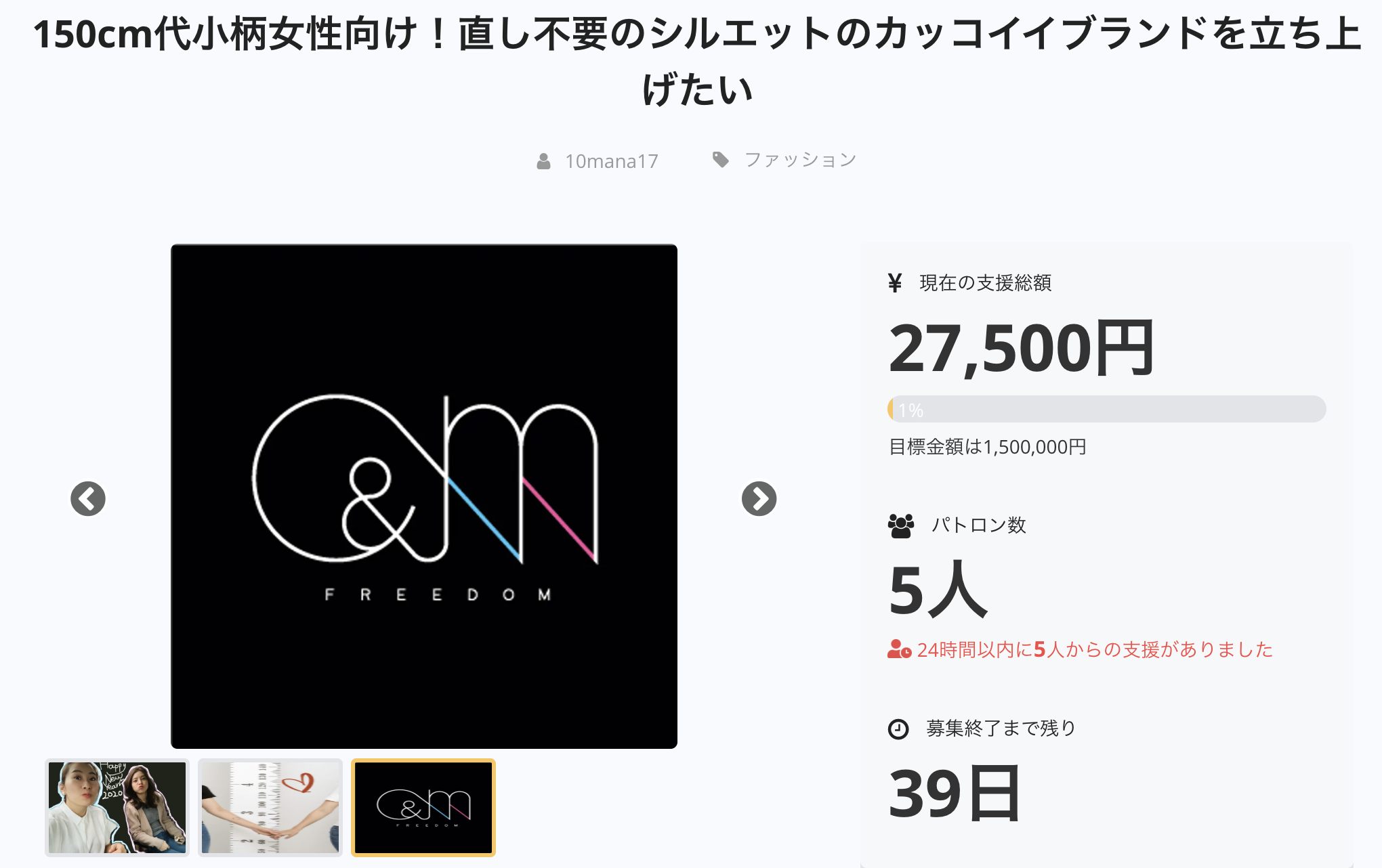 2020/01/22 22:00クラウドファンディング開始から約12時間経過致しました。5人のパトロン様にご支援いただけている!!嬉しい限りです。しかもエシカルTシャツの4枚のご希望まで!実現させたいという気持ちがますます高まる一方です。1日目のスタートに支援してくださったパトロンの皆様、本当にありがとうございます。引き続きのご支援・ご声援をどうぞ宜しくお願い致します。単純計算で1日あたりの目標金額は39,000円です!皆様に共感・応援していただけるよう、より精進して参ります。 もっと見る始まりました!!