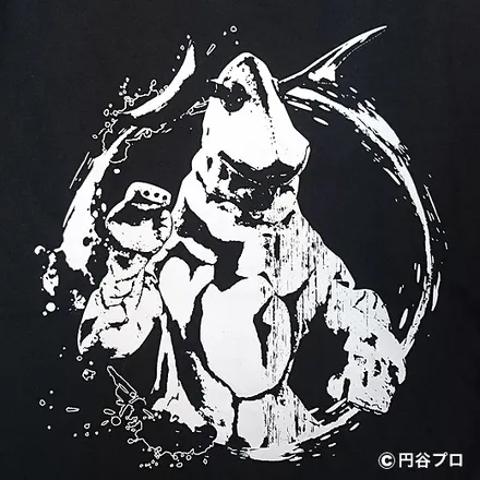 ◇フロント:ウルトラセブン第3話「湖のひみつ」より、西湖の波しぶきと宇宙怪獣エレキングの2つで構成しました。個人的に円谷作品から感じる "水" の印象は、少しツヤ感があり、ほんの少しネットリ感があります。怪獣の重量感を出すためのスロー再生がそういう印象に繋がっているのかも知れませんが、 1)ボコボコと気泡が立って 2)ピカッと水中が光り 3)怪獣がヴァシャーッ!のあの感じ、とても好きです。今回はエレキングに少し動的な要素を加えるために、波をグルッとさせました。また、プリントもエレキングの半身は"カスレ"表現を交え、キャラクターグッズではなくアパレルブランドのクオリティを心がけて制作いたしました。