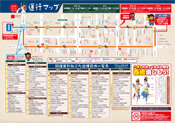「青森ねぶた祭オフィシャルサイト」から「運行マップ」がダウンロードできます。この運行マップと照らし合わせてご覧いただくと非常に分かりやすいのでオススメいたします。