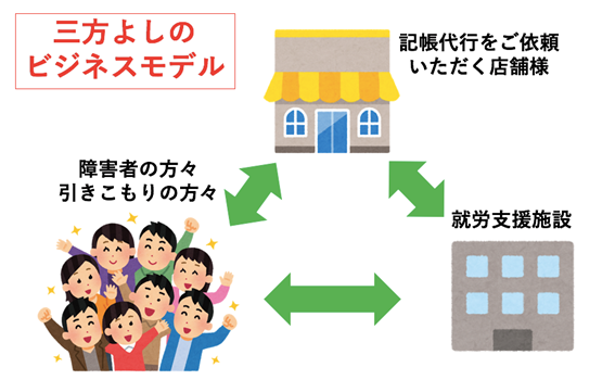 今回の記帳代行プロジェクトは 、世の中の「障害者の方や引きこもりの方」と「就労支援施設」、そして記帳代行をご依頼いただく「お客様」の三方よしのビジネスモデルだと考えております。